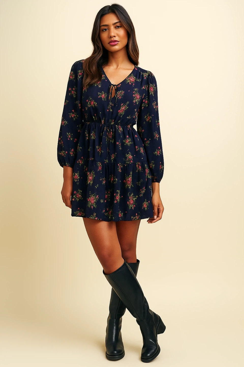 Selling a cute Juicy Couture silk dress. It features a lovely floral pattern on a navy background. Perfect for a casual day out or a special occasion