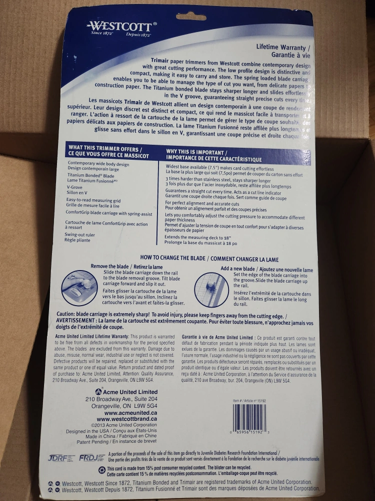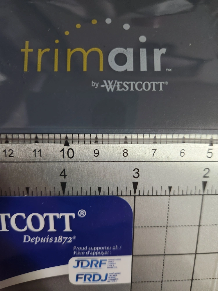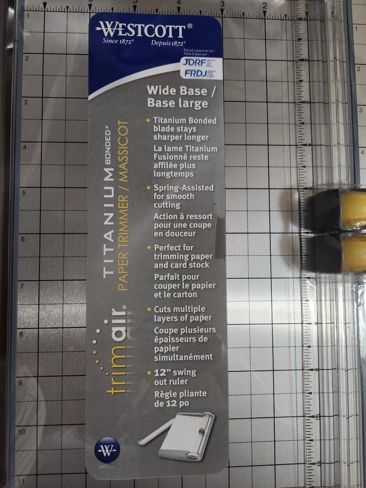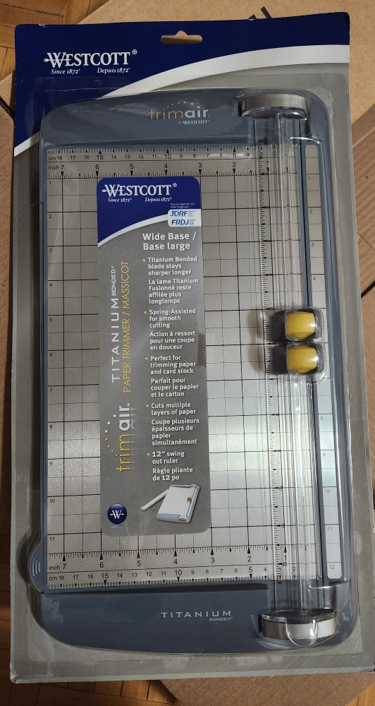 Westcott TrimAir paper trimmer with a wide base! It features a titanium bonded blade that stays sharper for longer. It's spring-assisted for smooth cutting and perfect for trimming paper and card stock. It can cut multiple layers of paper simultaneously and has a 12" swing-out ruler. Great for all your crafting needs! Sells new for $100 on Amazon. Brand new in packaging. Please check my other listings.
