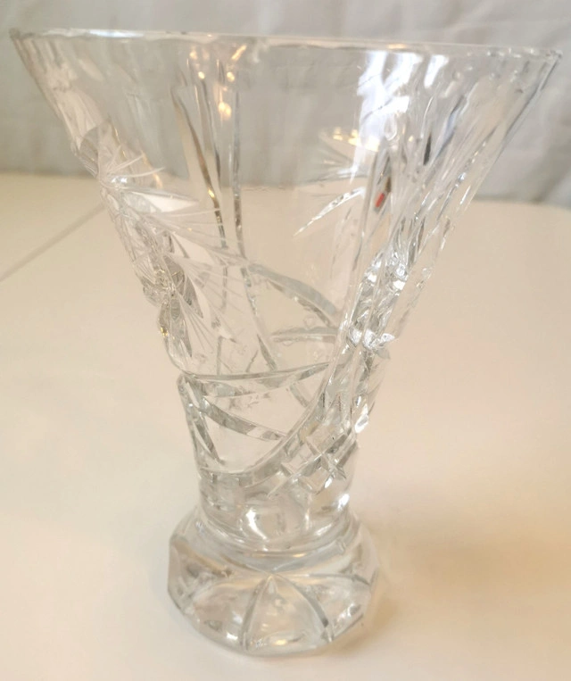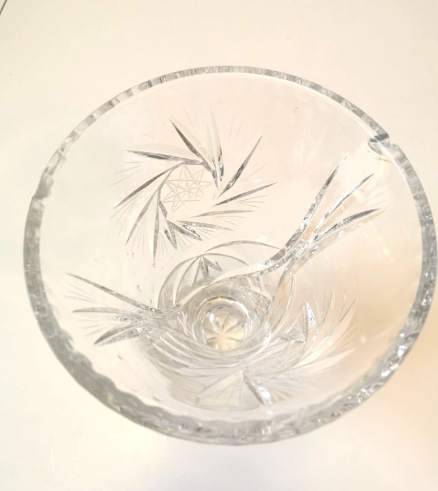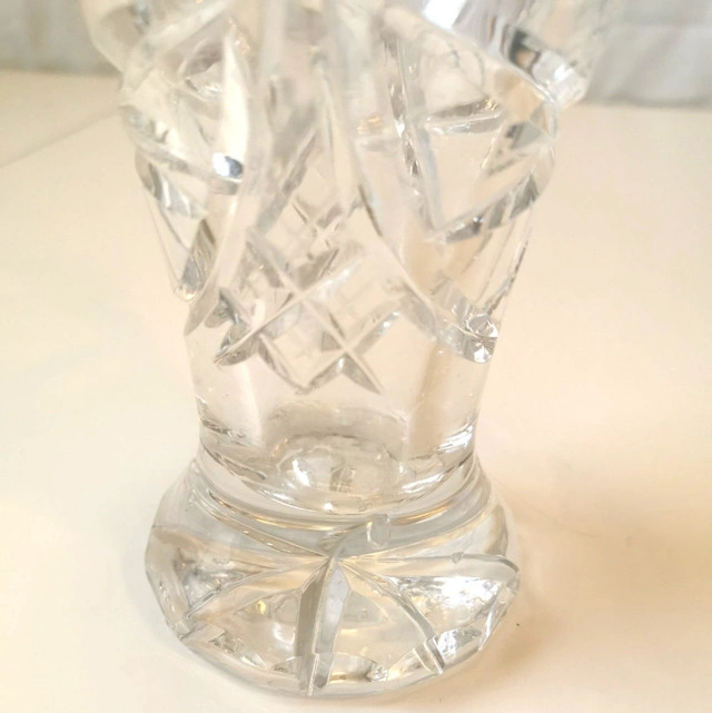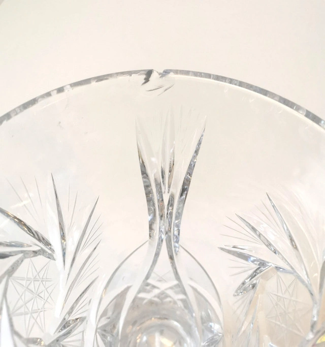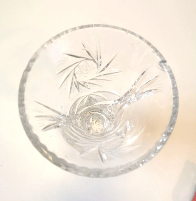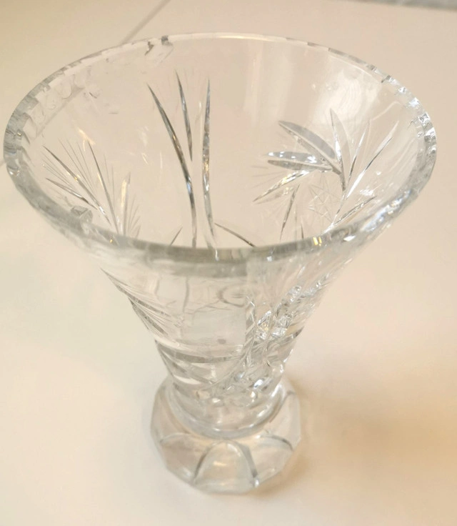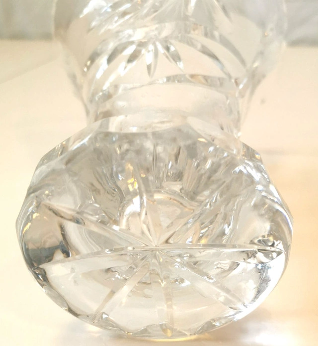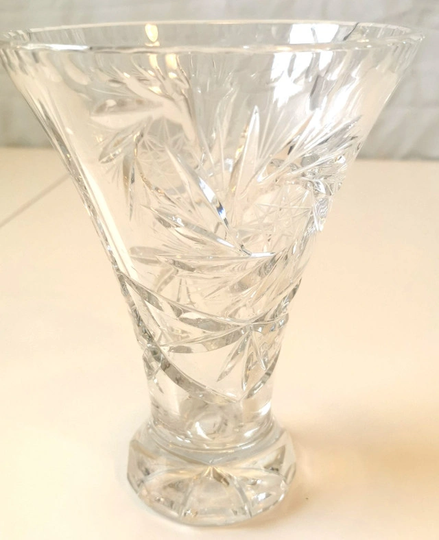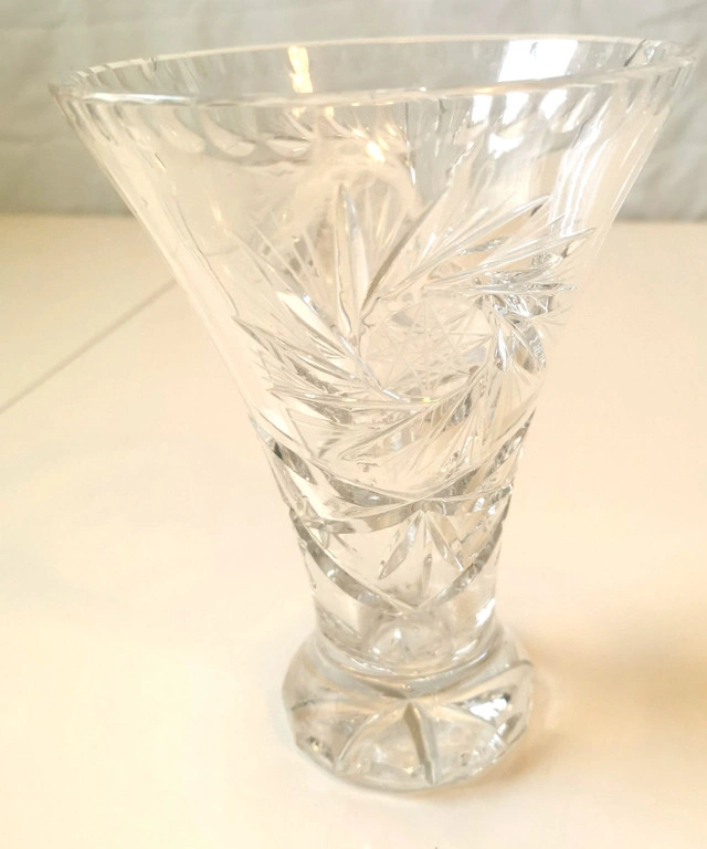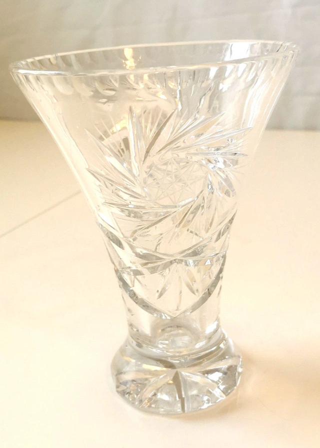 Elevate your home decor with the timeless elegance of this vintage Cut Glass lead crystal vase. Standing at 7.25 inches tall with a diameter of 5.25 inches, it's the perfect size to showcase your favorite flowers or to stand alone as a striking centerpiece. The clear crystal allows for versatility in placement, ensuring it fits seamlessly into any room or occasion. Expertly crafted to catch and reflect light, this crystal vase adds a touch of sophistication to your collection. Whether you're a seasoned collector of vintage items or simply seeking to add a classic piece to your decor, this Cut Glass vase is sure to impress. Condition: Shows gentle signs of age, two minor chips near the top. These small imperfections add character and are consistent with a piece of this age please reference photos as part of description.