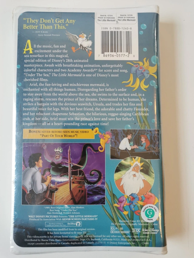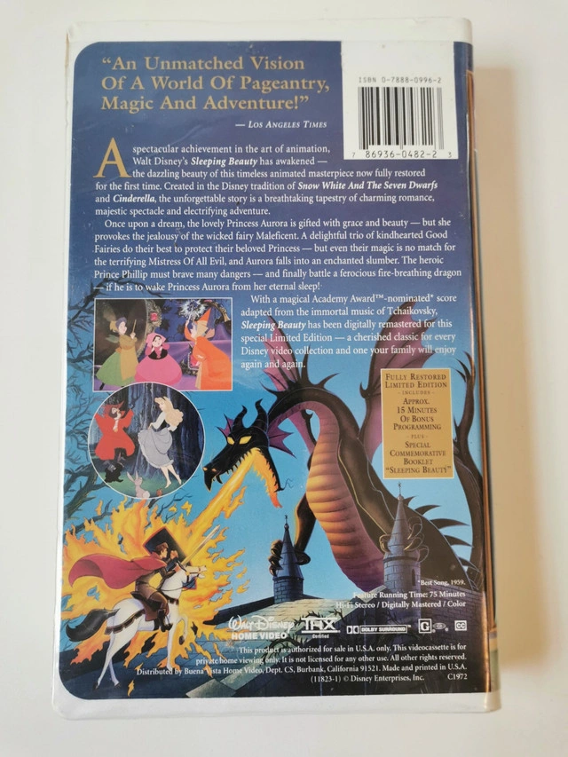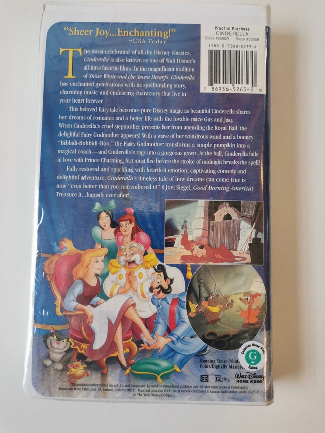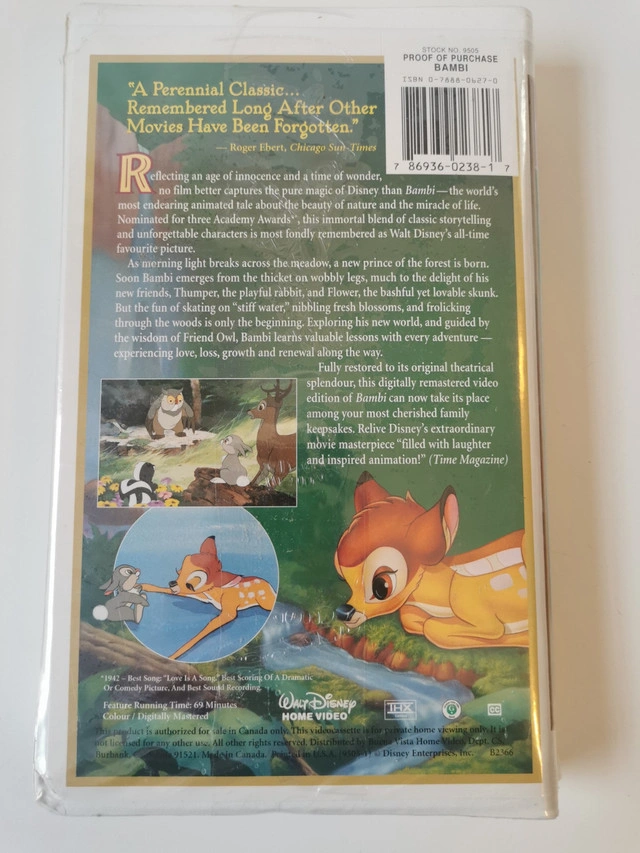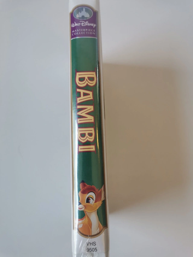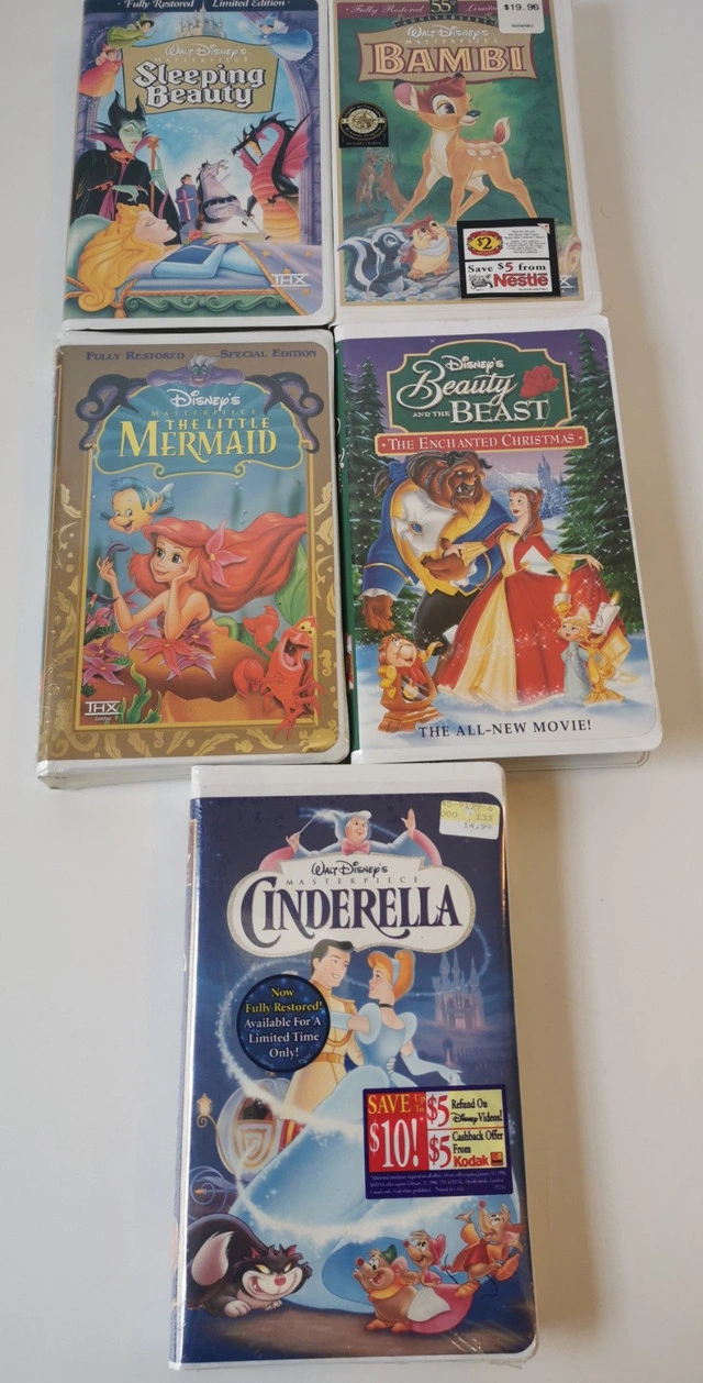 Classic Disney VHS collection featuring beloved tales like "Sleeping Beauty," "Bambi," "The Little Mermaid," "Beauty and the Beast," and "Cinderella." All in original packaging; however, some plastic may have been punctured around the edges while moving.