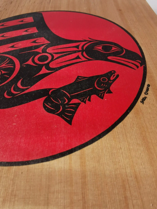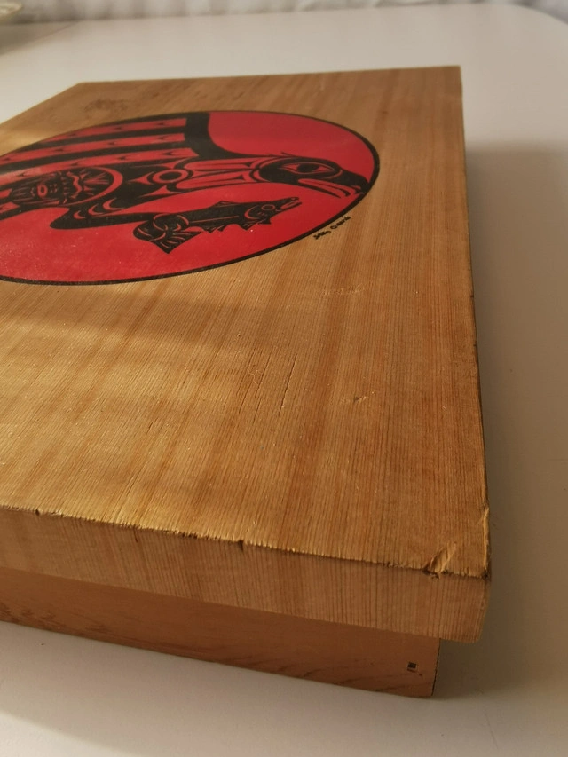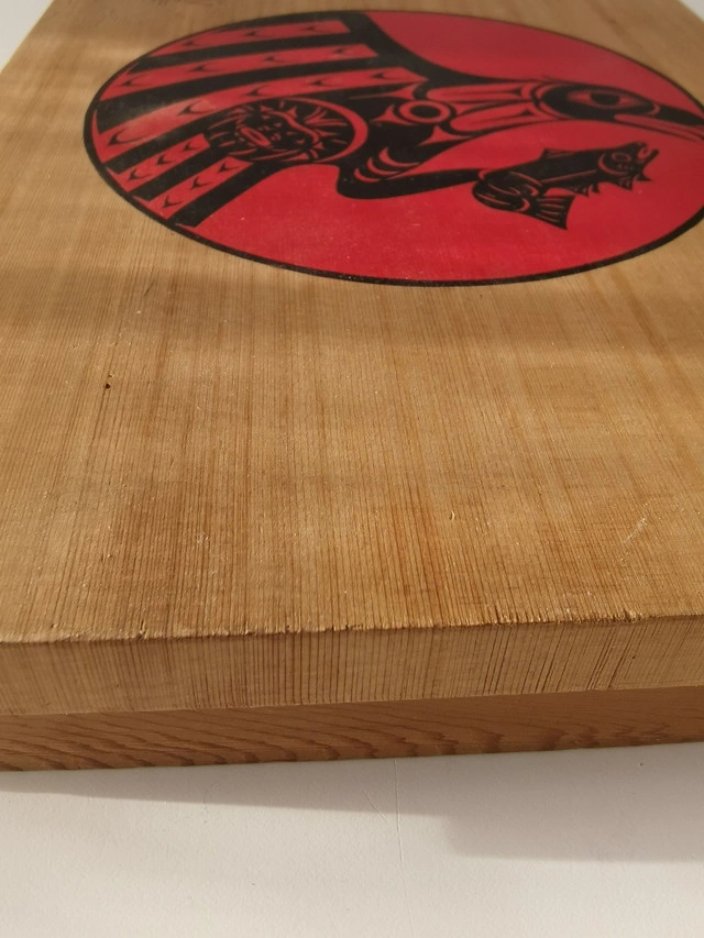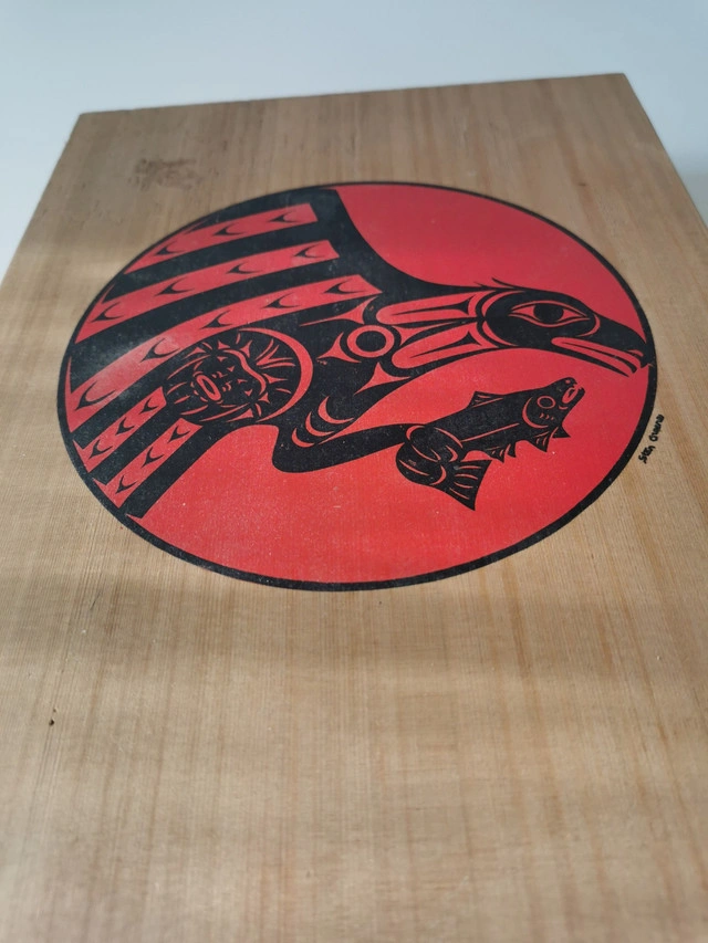 Experience a piece of Canadian Aboriginal artistry with this vintage smoked salmon Cedar Box, fine craftsmanship artistery by Sam Greene. Stan Greene lives in Chilliwack, BC. He is a respected and well established contemporary first nation Salish artist. The box celebrates the rich Salish culture and is a testament to the skilled hands that crafted it. With its origins dating back to the 80s, this piece not only serves as a functional storage but also as a cultural artifact, embodying the spirit and heritage of the First Nations. NOTE: Vintage item light wear