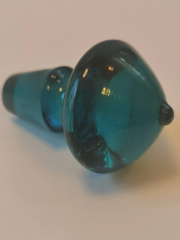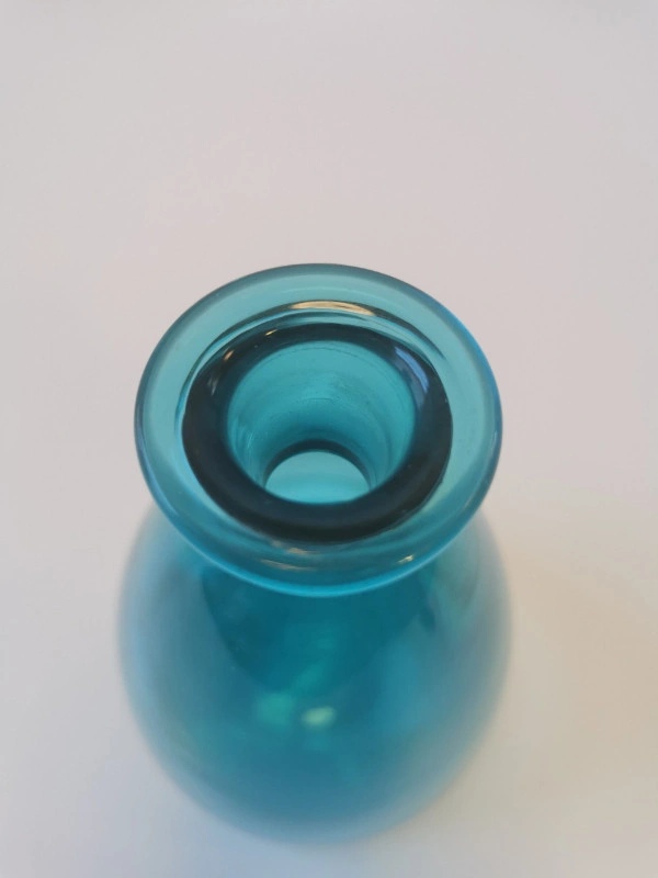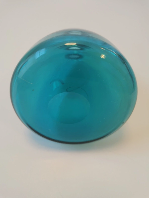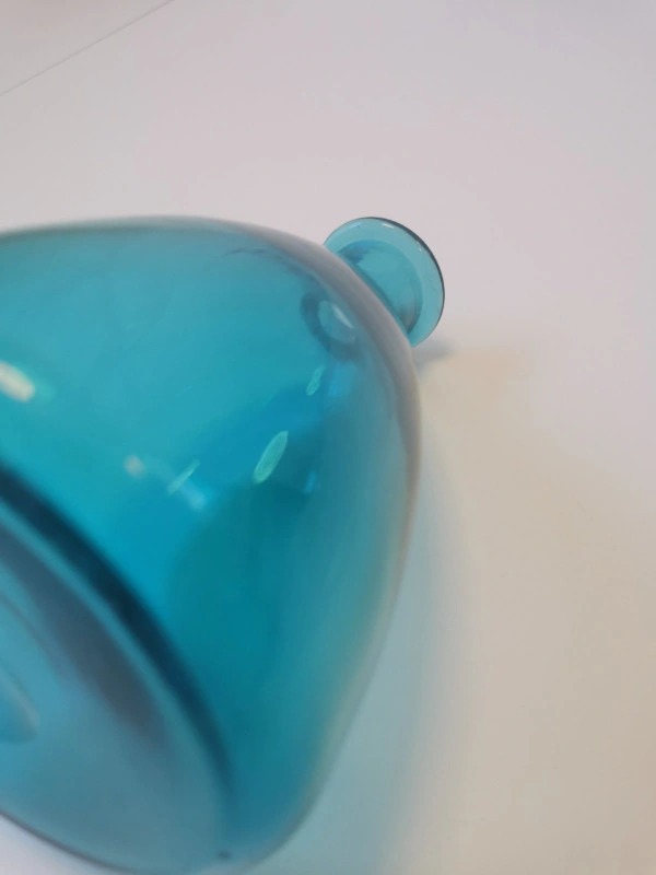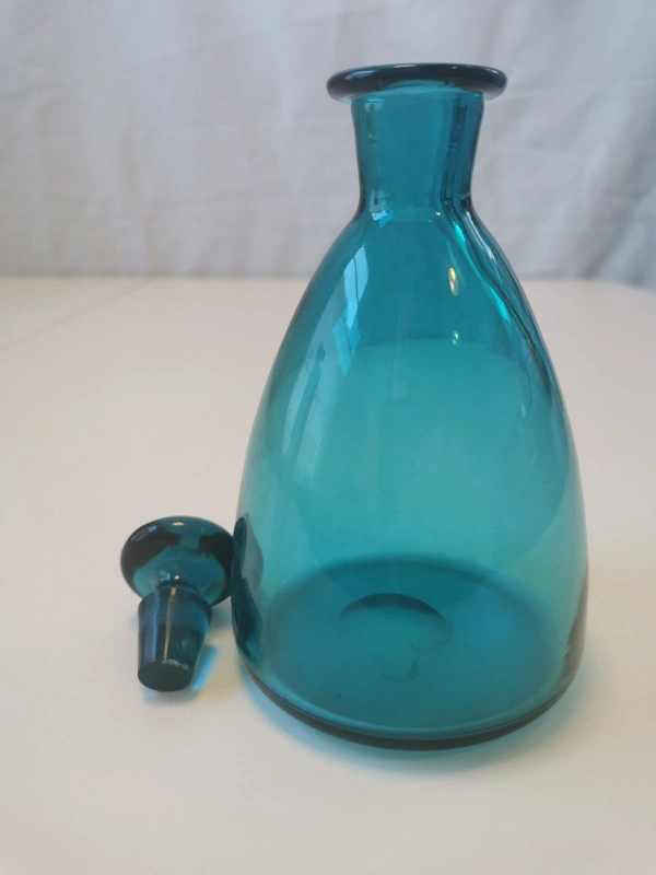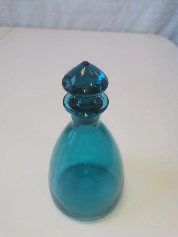 Elevate your barware collection with this vintage-style light blue decanter, a charming addition that harkens back to the 1960s. The set includes two pieces: the blown glass decanter itself and a matching lid, ensuring your beverages stay fresh and presentable. Its stylish silhouette and vibrant hue make it a standout piece for any gathering or display. Crafted from high-quality glass, the decanter's origins are shrouded in mystery, adding an element of intrigue. Regardless of its maker, the craftsmanship is clear, with a simplicity that complements any decor. Whether you're a collector or just appreciate the elegance of yesteryear's design, this set is sure to impress. Dimensions: Height 7.5 inches, Diameter 4 inches at widest point. NOTE: Vintage item in good condition slight wear on inside of lid