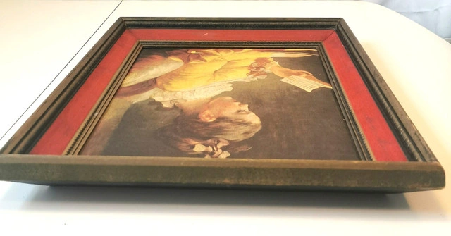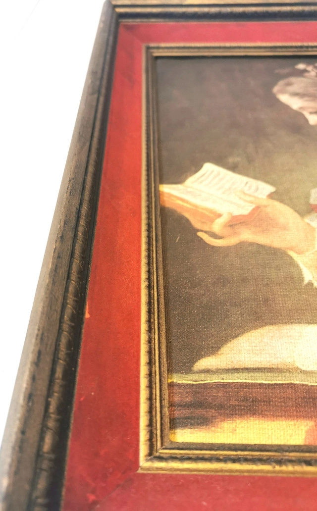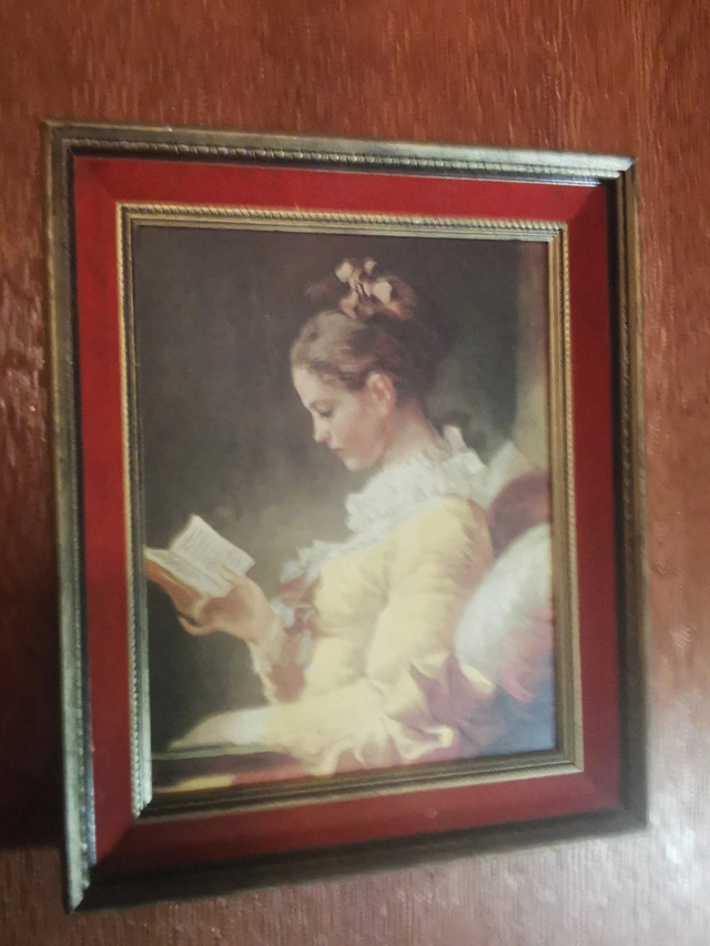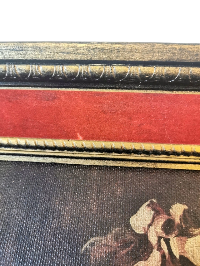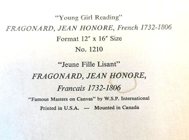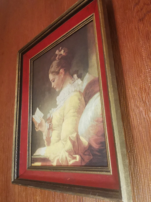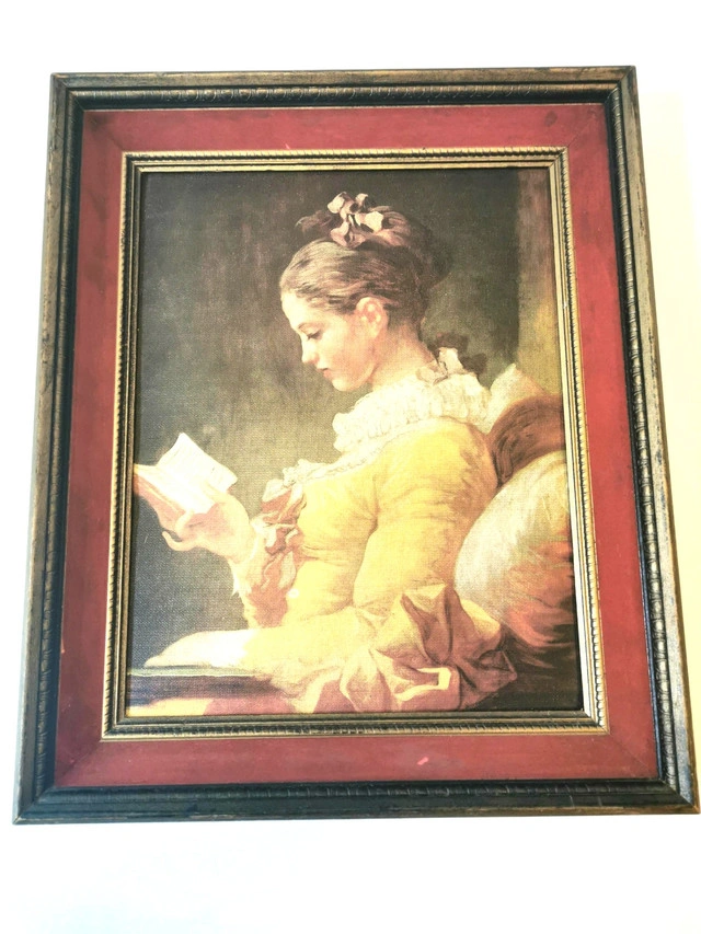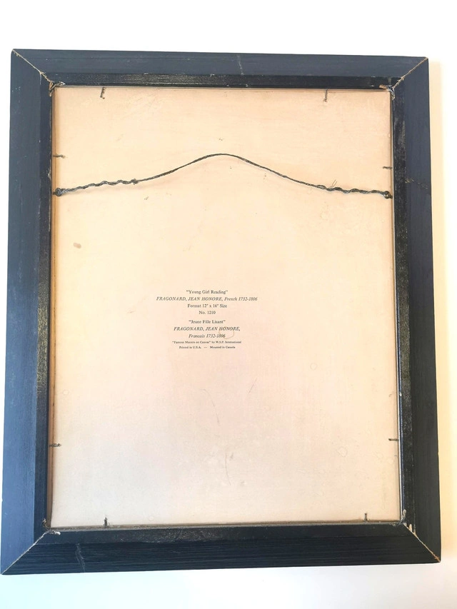 This listing features a rare mid-century limited edition canvas print of Jean-Honoré Fragonard’s “Young Girl Reading” (“Jeune Fille Lisant”), numbered 1210 from the “Famous Masters on Canvas” series. Key Details: Artist: Jean-Honoré Fragonard (French, 1732–1806) Title: Young Girl Reading / Jeune Fille Lisant Edition: Limited Edition No. 1210 (1950s) Frame: Original 1950s deep wood with red velvet inner trim and gold-tone fillet Condition: Good vintage condition; plush velvet trim intact; some wear on frame edges and print pleae reference photos as part of the description Provenance: Printed in the USA, mounted in Canada; original manufacturer’s label on back Ready to hang. Ideal for collectors of rare mid-century art prints and lovers of Rococo-inspired décor Dimensions- Height 17.5 inches, Width 14.5 inches, Depth 2.75 inches