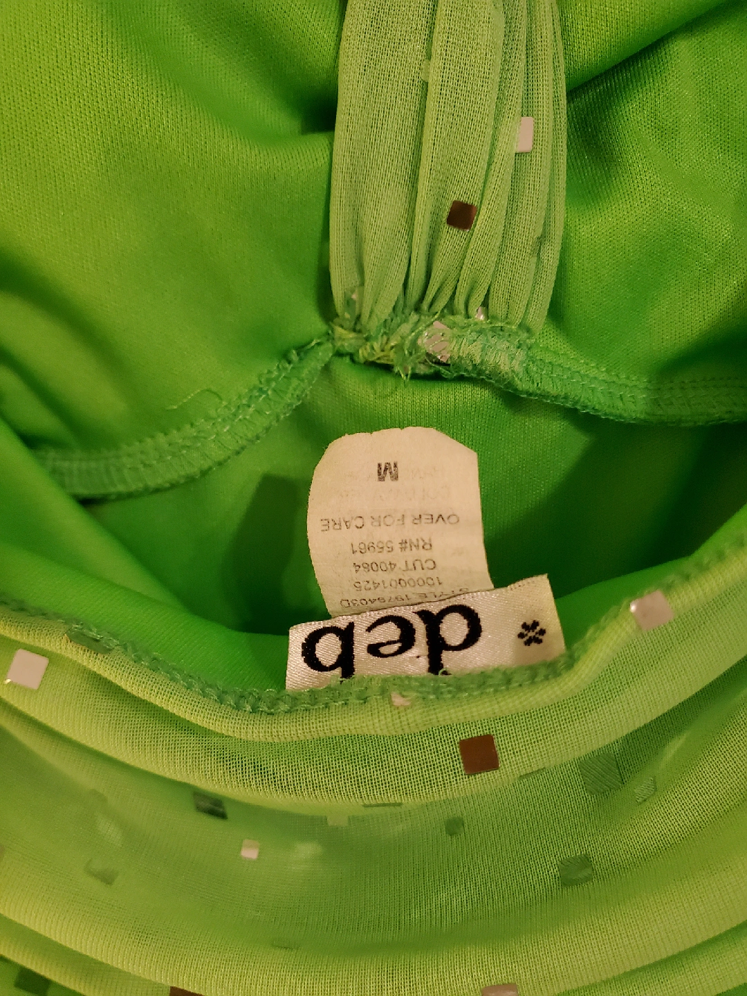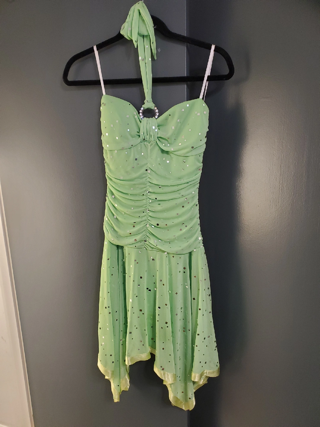 Selling a cute green Deb dress! It's a halter style with a sparkly ring detail at the neck. The dress has a fun, flirty look and is in great condition. Size is Medium. One gem is missing.