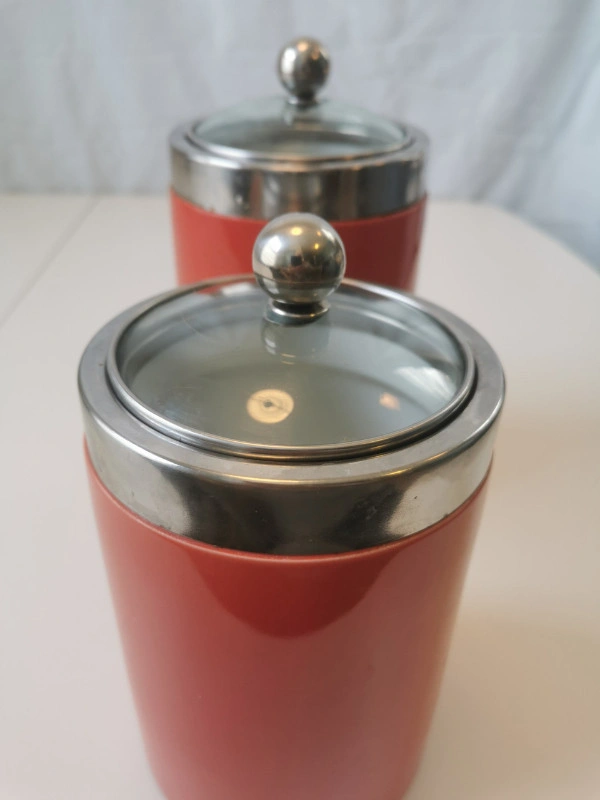Two Maxwell Williams Kitchen Canisters very heavy duty vintage. NOTE: Vintage items wear on the larger canister on the stell rim has small amount of rusting and glue has come loose please reference photos. Otherwise both clean inside and out and in good condition.