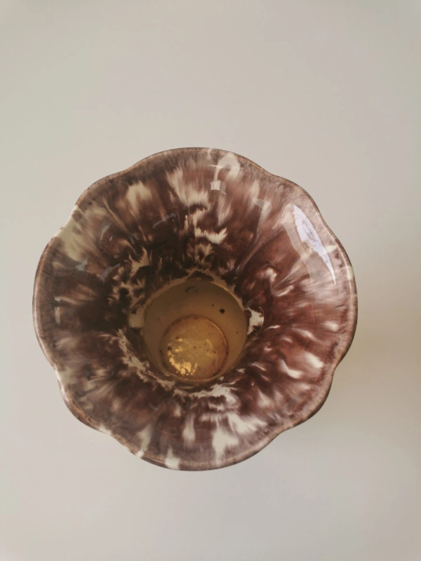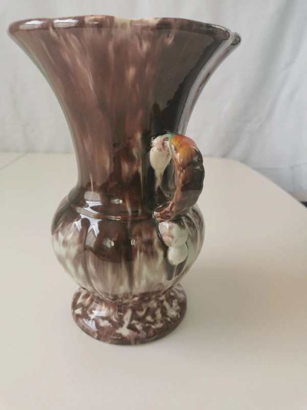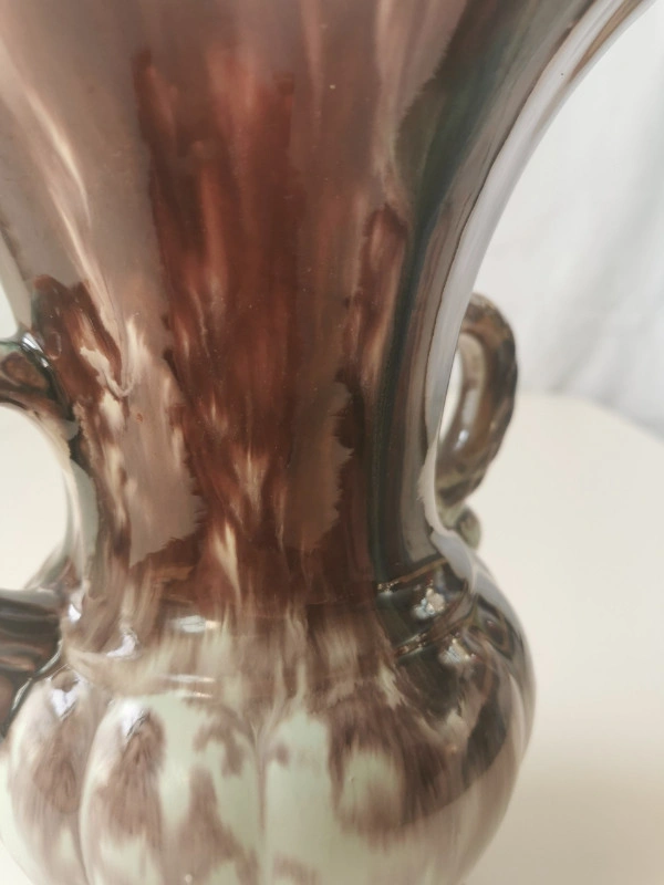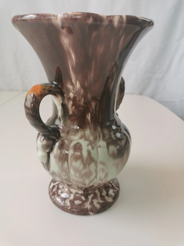 This vintage vase is made of ceramic with a white and brown drip glaze in a mid-century modern ornate style. It features double handles and has a multicolor art theme. The vase is unmarked and was produced in the 1960s using pottery techniques, showcasing an art pottery production style. Dimensions: Height 9.25 inches, Diameter at widest point 6 inches. NOTE: Vintage item in good condition slight wear on inside base please reference photos
