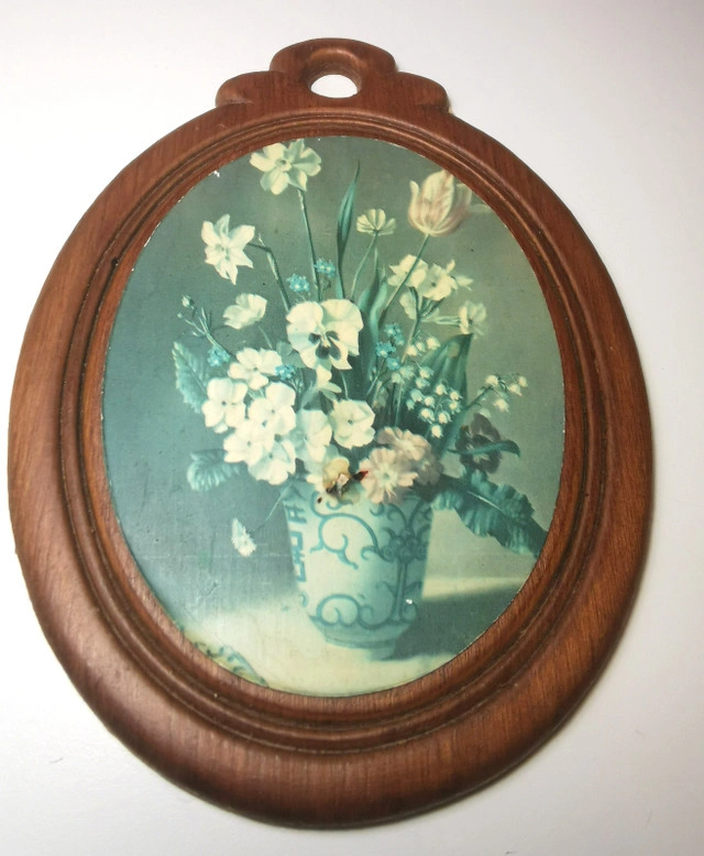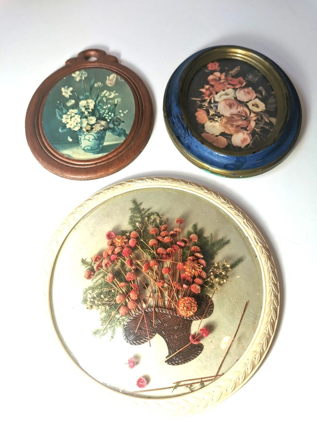 This product features three vintage to older vintage botanical wall hangings with a vintage reproduction style. The wall hangings are made of mixed materials and come in a variety of multi-colour options. The brand and country/region of origin are unknown, adding to the unique and eclectic charm of these decorative collectibles. Perfect for adding a touch of vintage flair to any space, these wall hangings are sure to be a conversation starter in any home decor. Dimensions: Blue Length 6.5 inches, Width 5 inches, Depth 1/8 of an inch approx. White Diameter 6.5 inches, Depth 1/8 of an inch approx. Brown Length 6.5 inches, Width 4.5 inches, Depth 1/8 inch approx. CONDITION: Brown good vintage condition slight wear White older vintage condition some loose strands of dried flowers contained within the glass some deterioration on back. Blue good vintage condition light wear