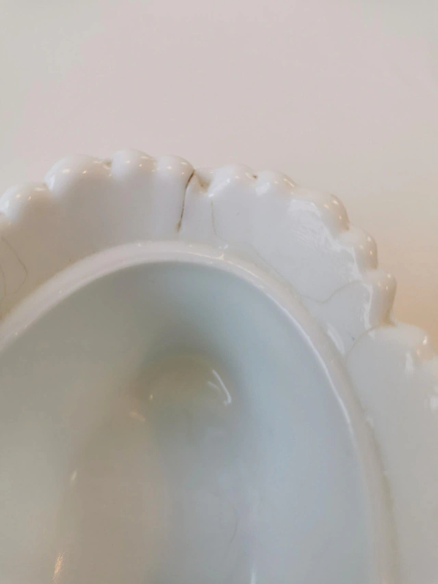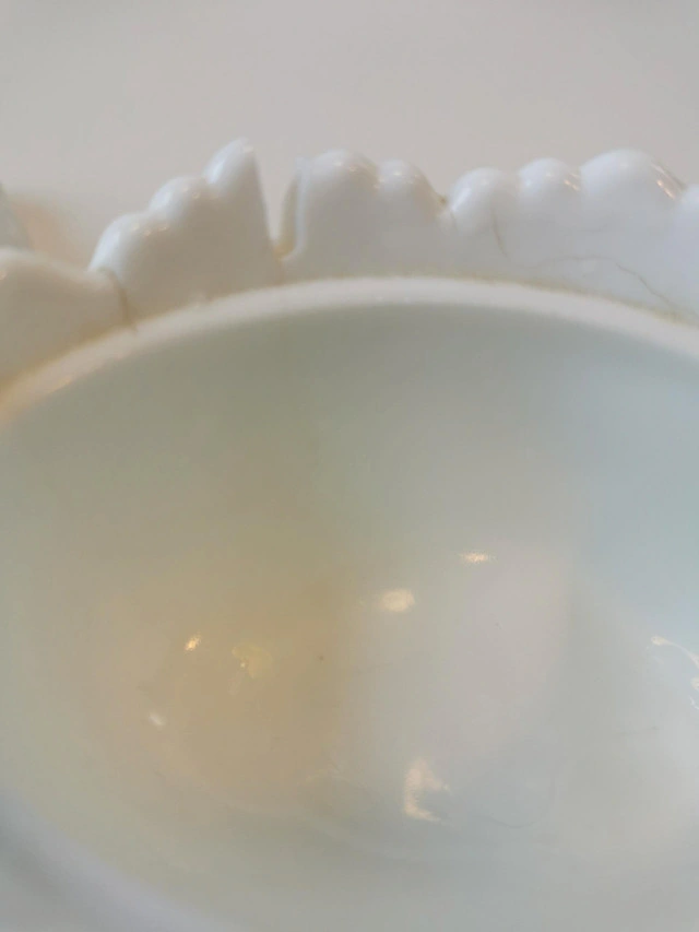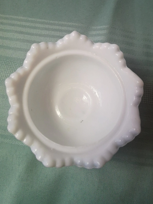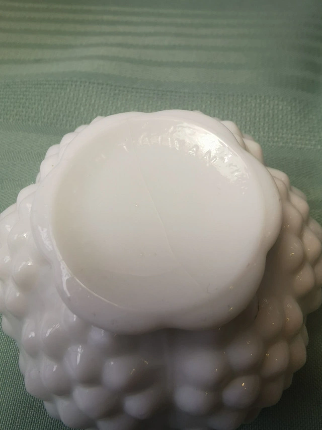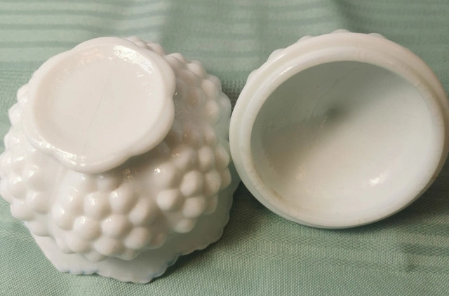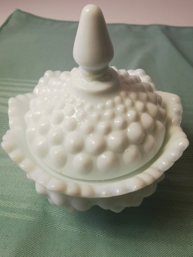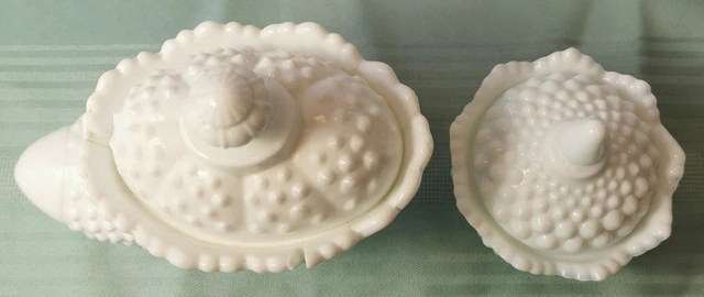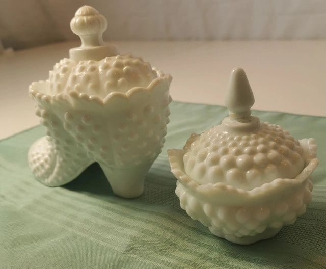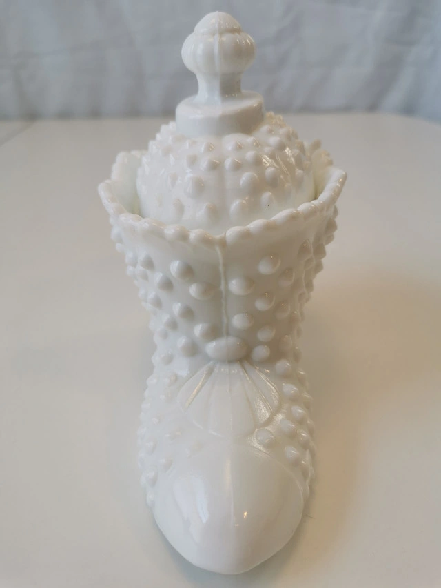 Crafted with care, this white hobnail shoe and trinket container by Fenton showcase a classic milk glass design, bringing a touch of elegance to any display. The ceramic construction promises durability, while the unique shape and marked lid make it a standout piece for collectors and decorators alike. Originating from Taiwan, these decorative pieces embody a blend of traditional craftsmanship and contemporary style. Its subtle sophistication is perfect for adding a refined aesthetic to your home. Enjoy the charm and craftsmanship of these delightful display pieces. Hobnail Shoe- 6 inches length, 3.5 inches width, 5.25 inches, height 5.25 inches Hobnail Container: 3.5 inches height, 3 1/8 inch diameter NOTE: Two vintage items Boot has some chipping as per photos, trinket container peak has been glued back on. Please reference photos.