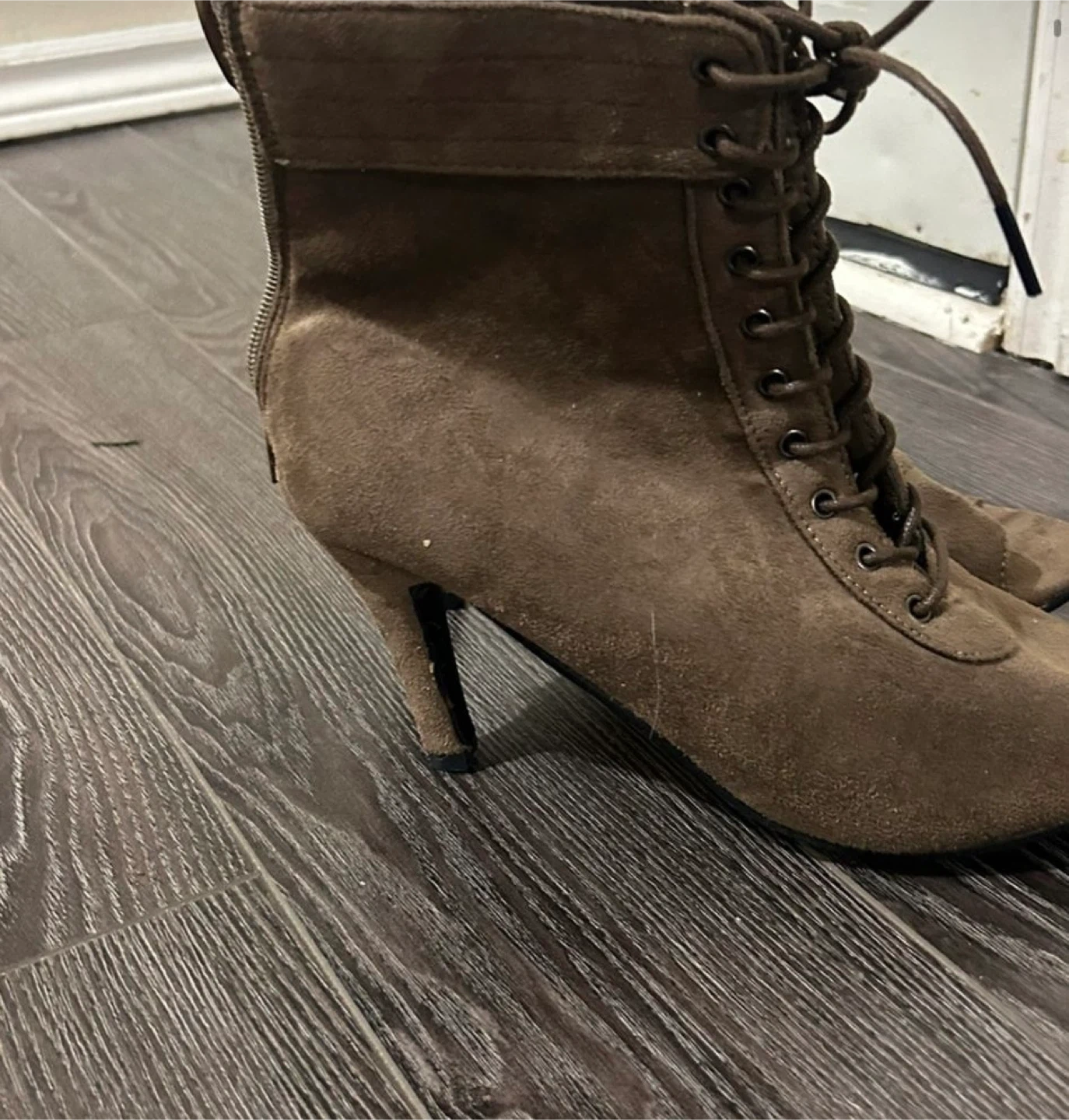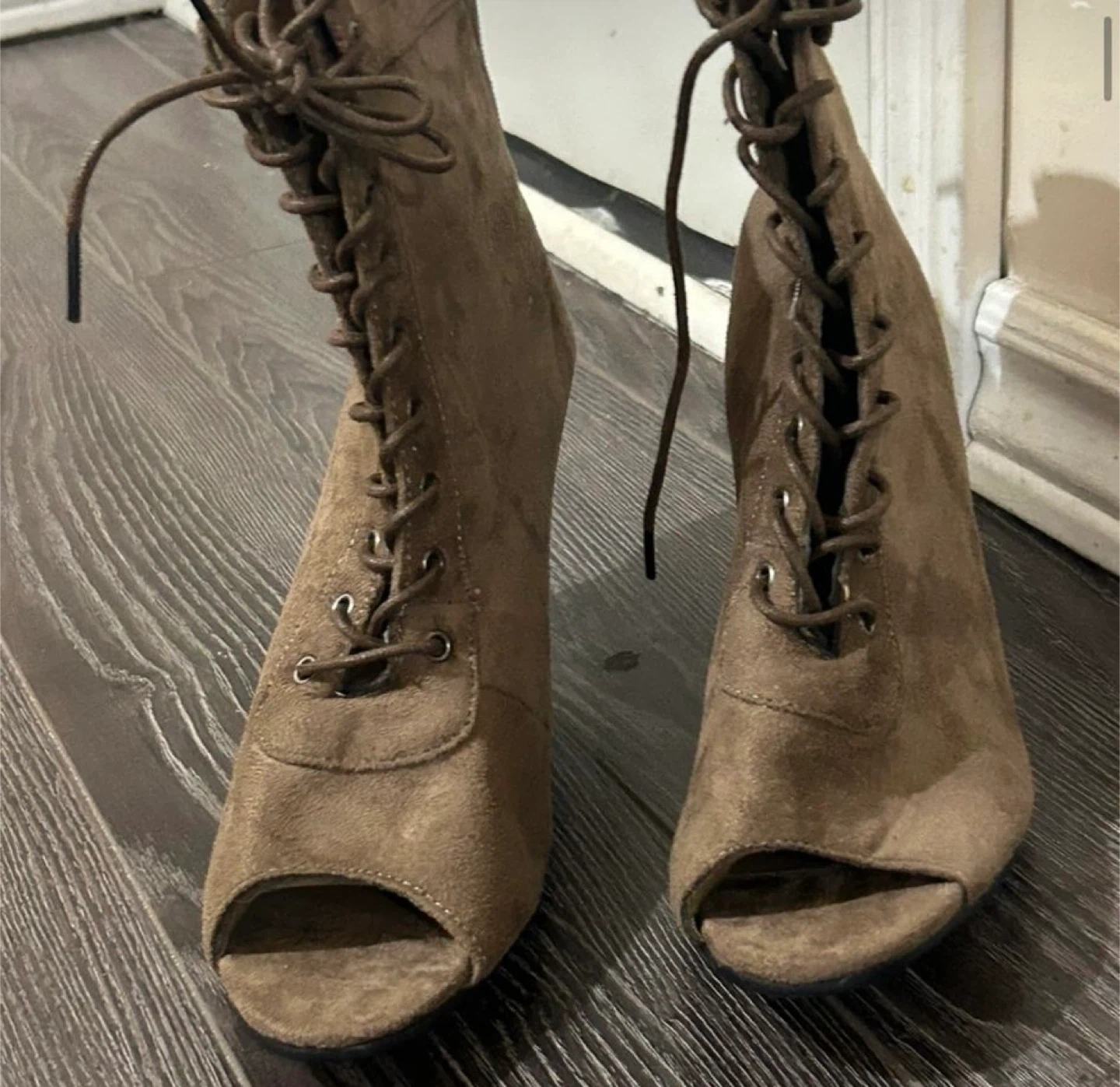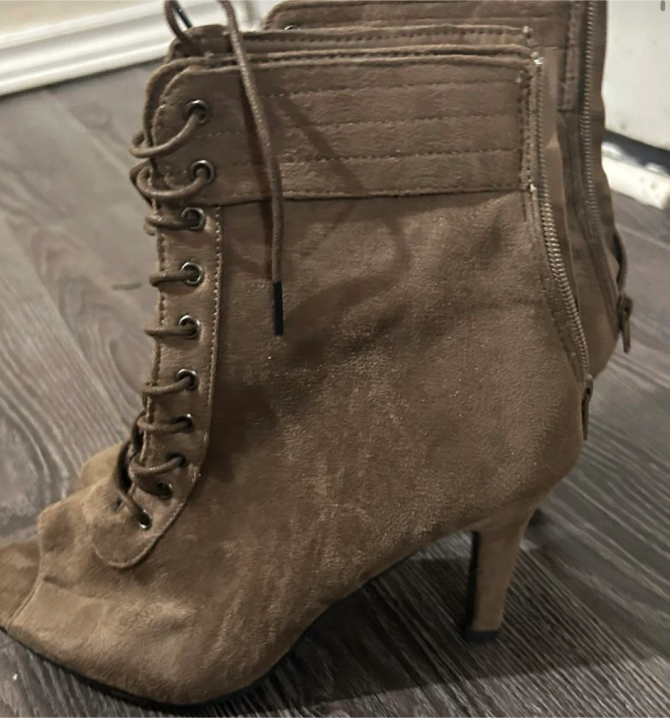 15Selling a pair of stylish brown suede peep toe booties! These feature a lace-up front and a heel. They're perfect for adding a touch of chic to any outfit. Great condition!