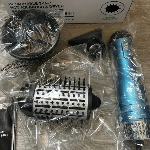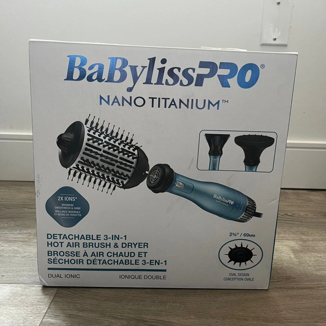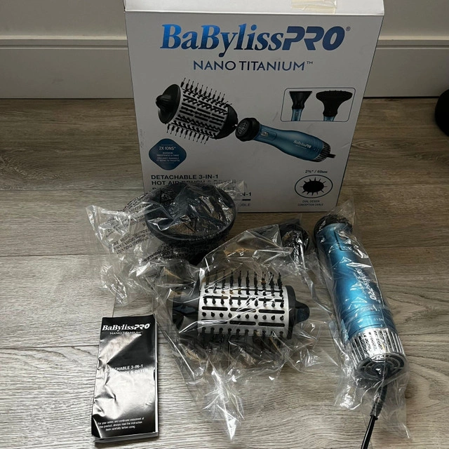 Get ready to experience salon-quality styling at home with the BaBylissPRO Nano Titanium 3-in-1 Hot Air Brush & Dryer. This brand-new styling tool combines the power of a hair dryer with the precision of a brush, giving you smooth, voluminous results every time. Here are some of its key features: * 3 detachable attachments * Dual ionic technology for maximum smoothness and shine * Nano Titanium and ceramic coated barrel * Two heat settings This hot air brush and dryer is ready to find a new home! Of course, if the ad is still up, it's still available!