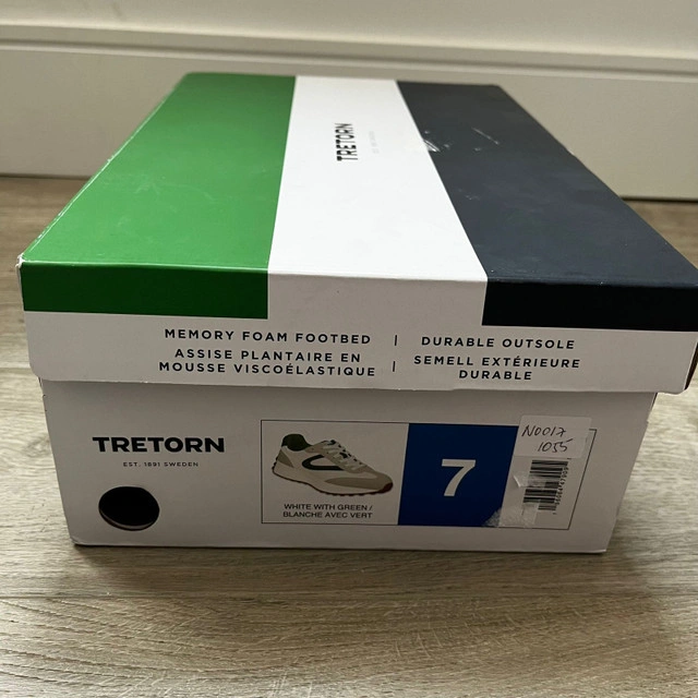 Step into style with these Tretorn white and green accent sneakers, a sporty and fashionable addition to any wardrobe. Its a BNIB shoes, these size 7 sneakers feature a memory foam footbed and a durable outsole for ultimate comfort and long-lasting wear. Whether you're hitting the gym or running errands, these sneakers provide the perfect blend of style and functionality.