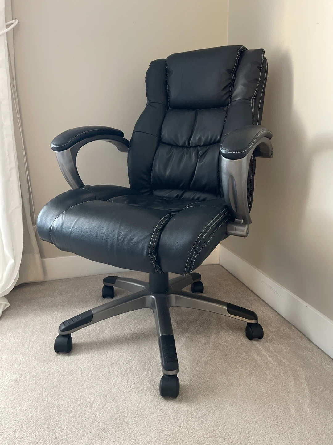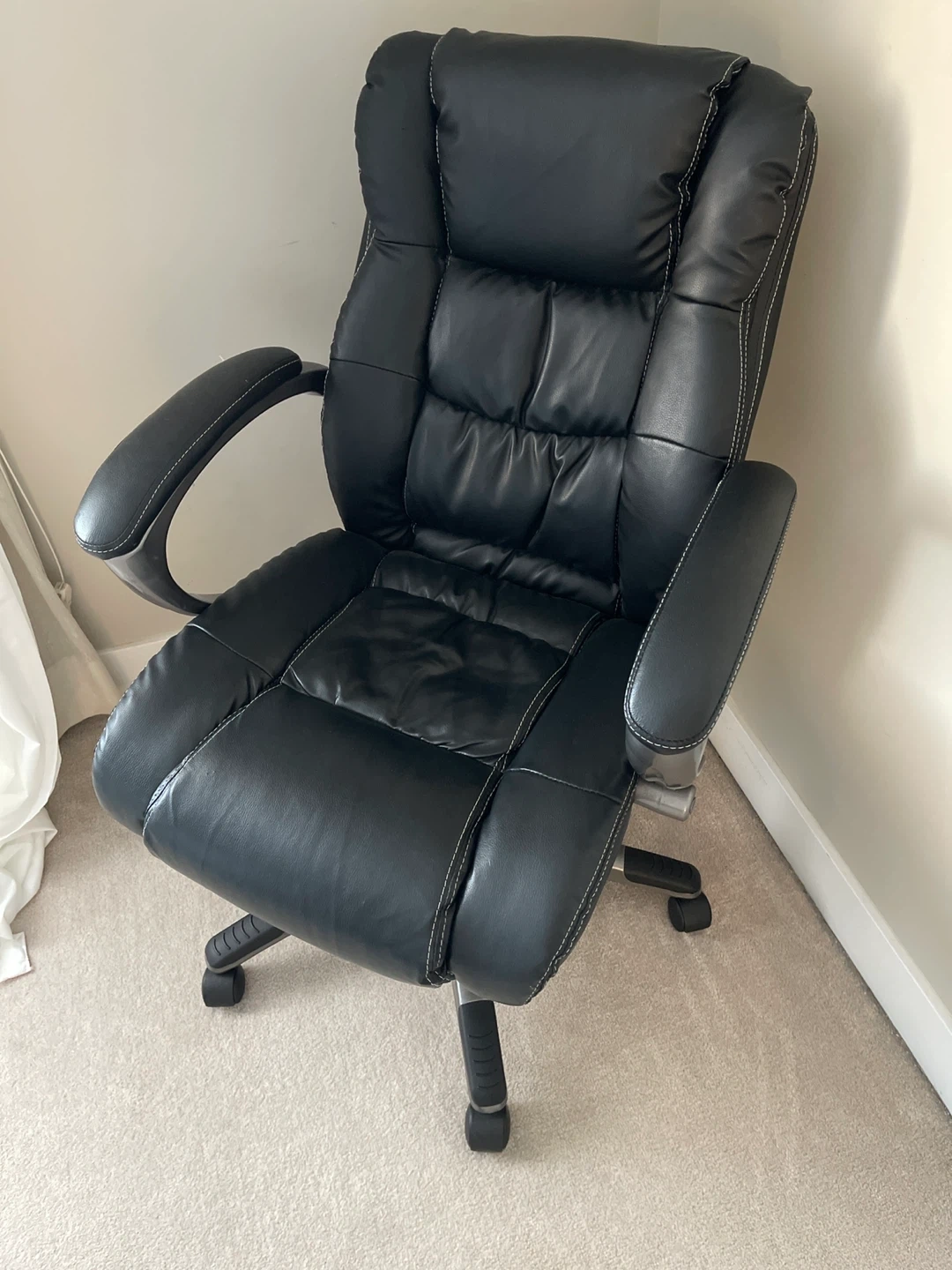 Selling a comfortable black leather executive office chair. It's in good condition and perfect for a home office or workspace. The chair features a high back, padded armrests, and a sturdy base with wheels for easy movement.