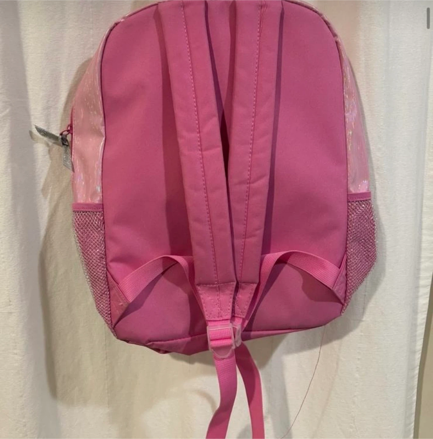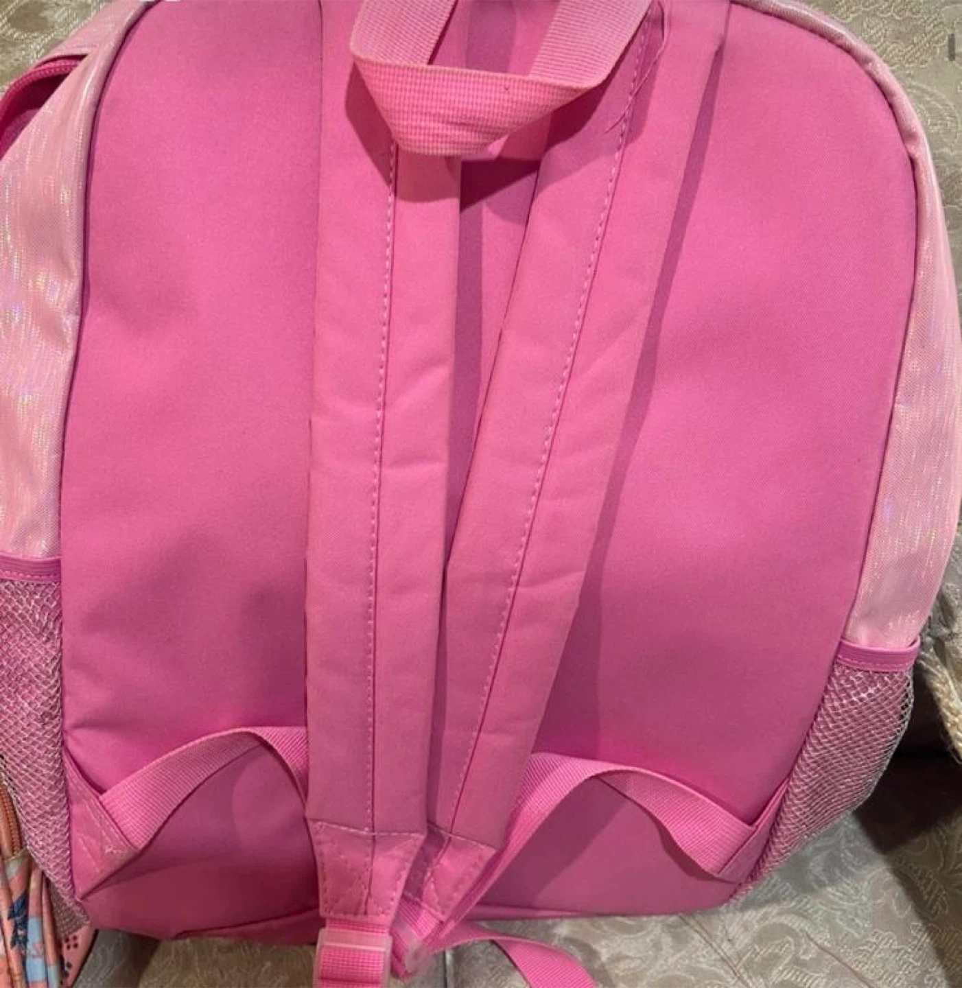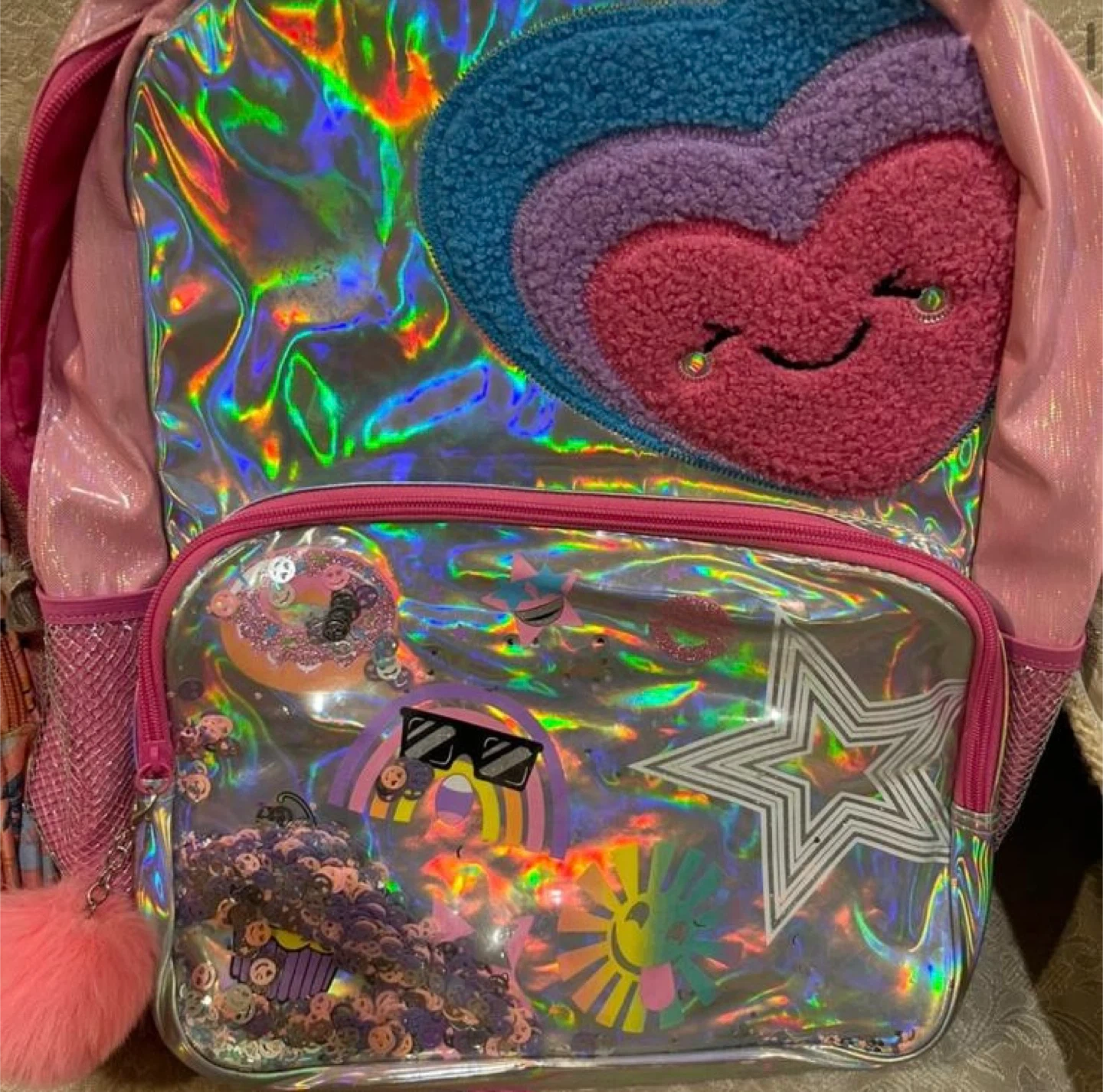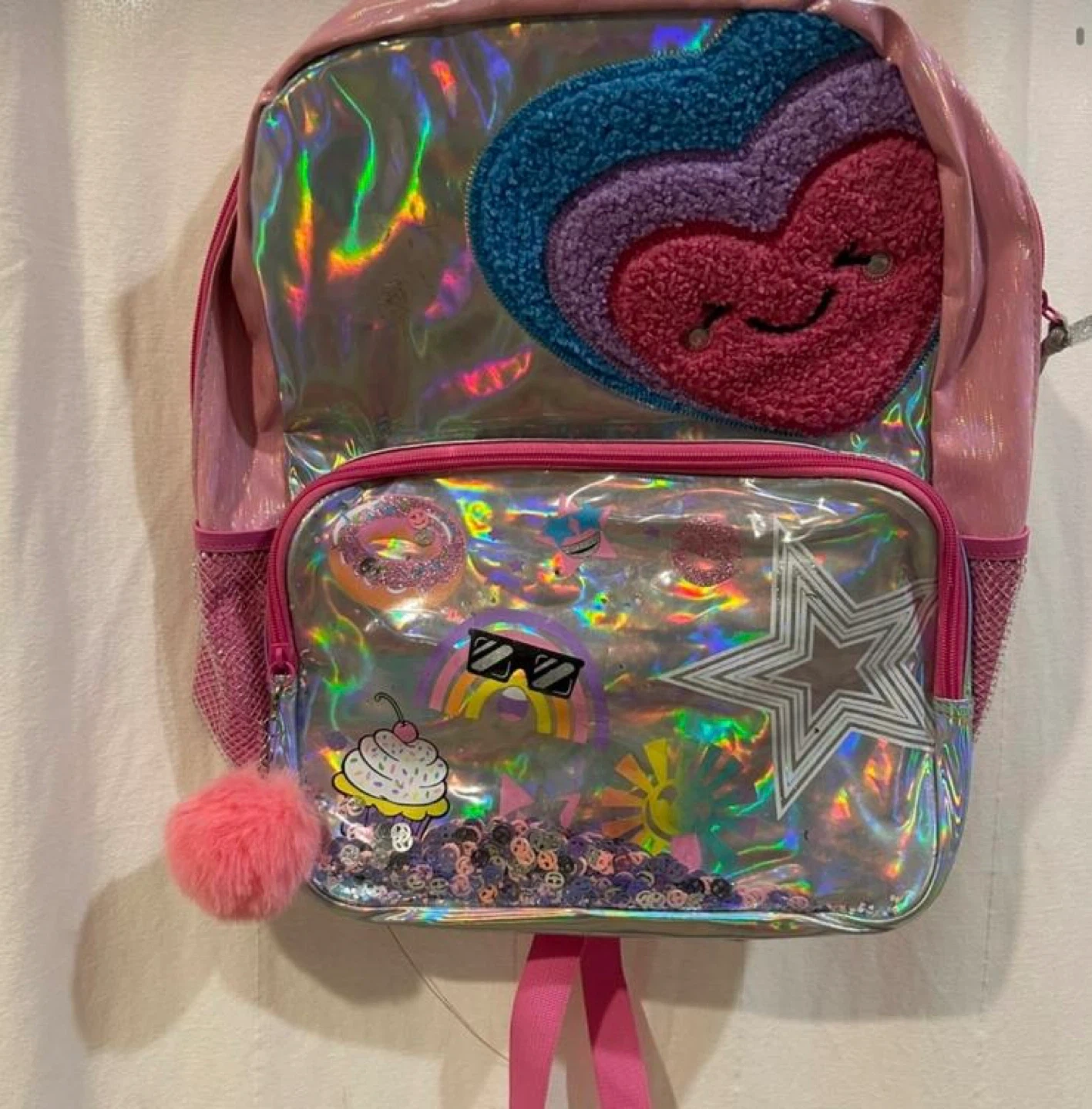 Selling a cute pink backpack for kids! It features a sparkly design with a heart and fun graphics. Perfect for school or outings