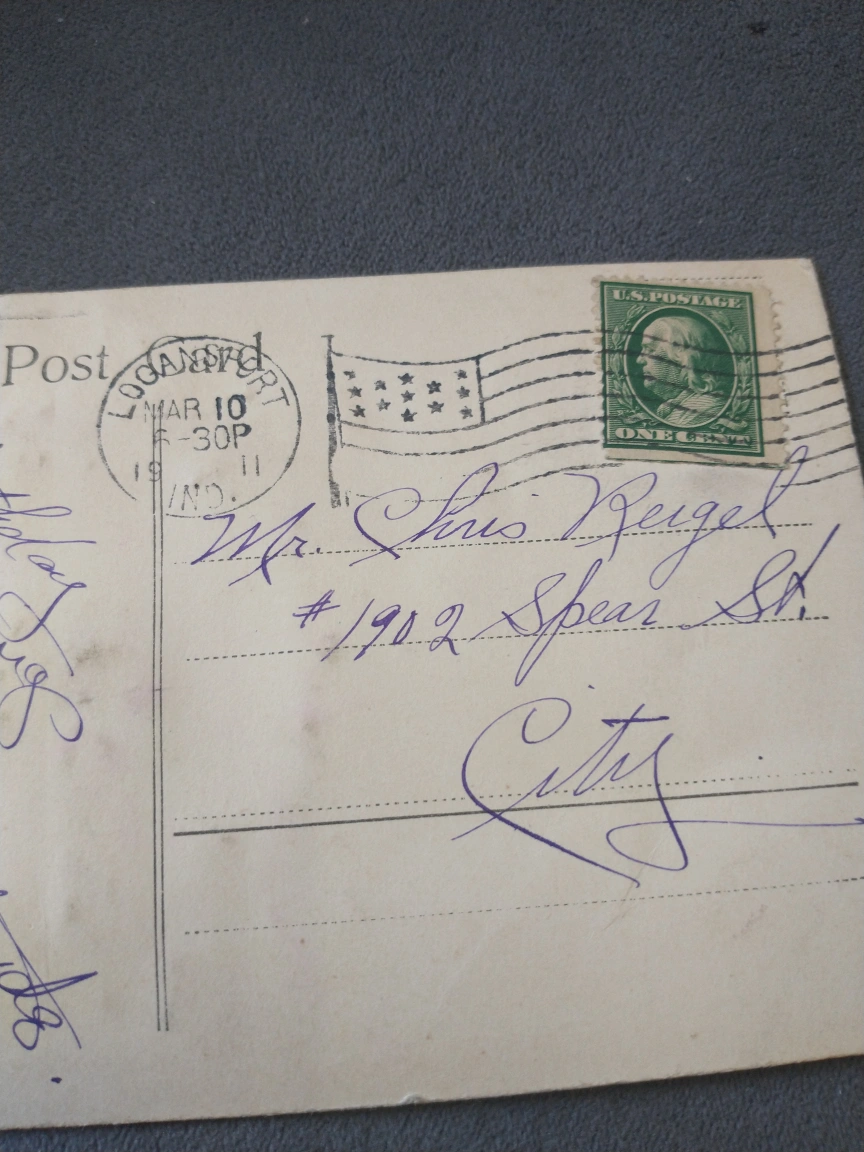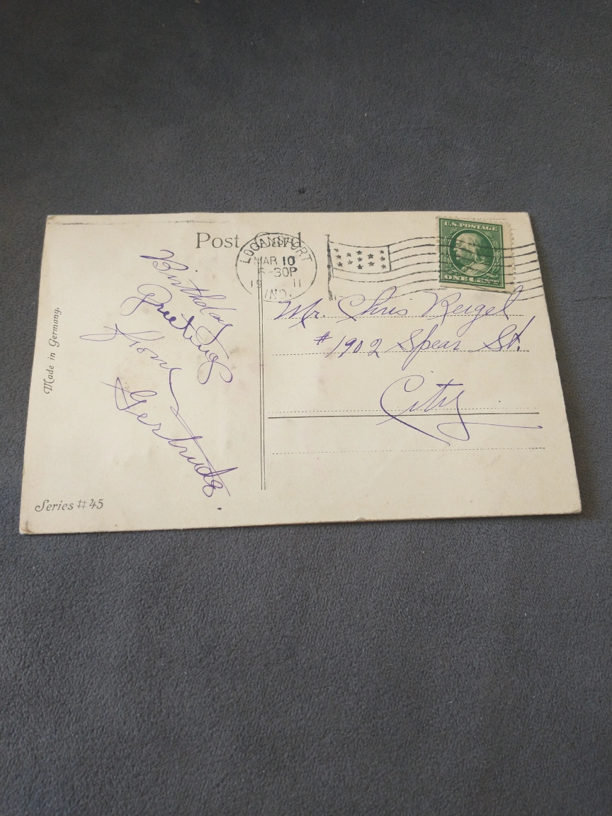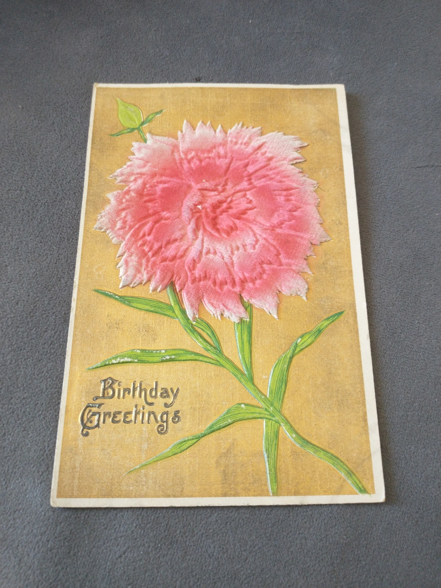 In box 9. Raised felt rose birthday postcard postmarked 1911 in Indiana