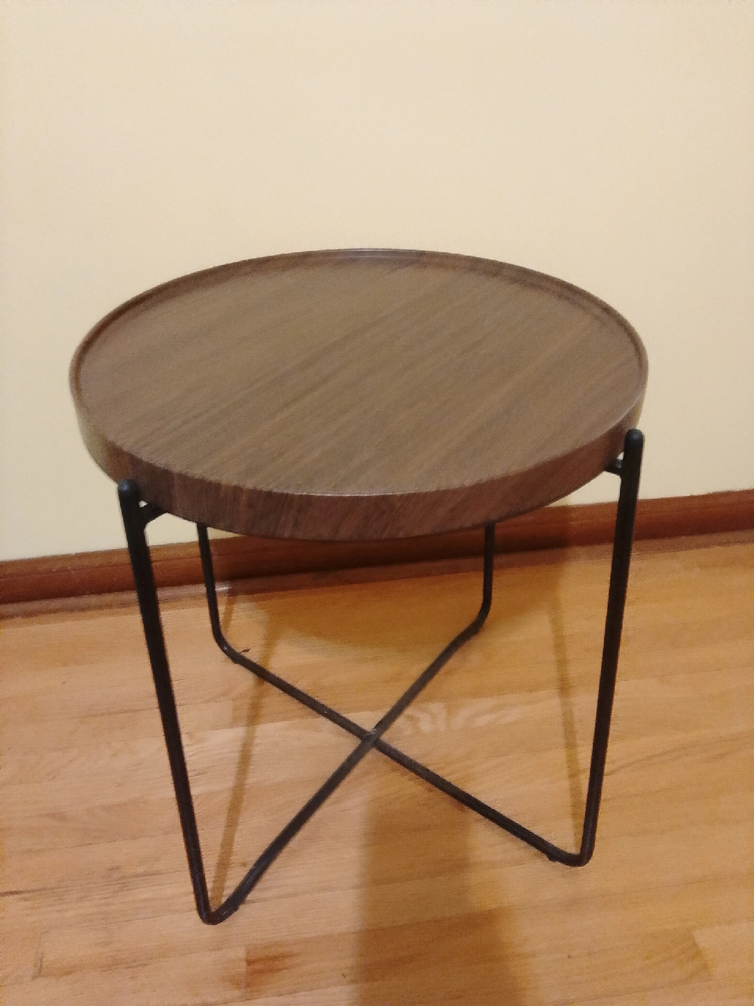 Selling a cute little round side table! It has a wood-look top and black metal legs. Perfect for small spaces or as an accent piece in your living room or bedroom.