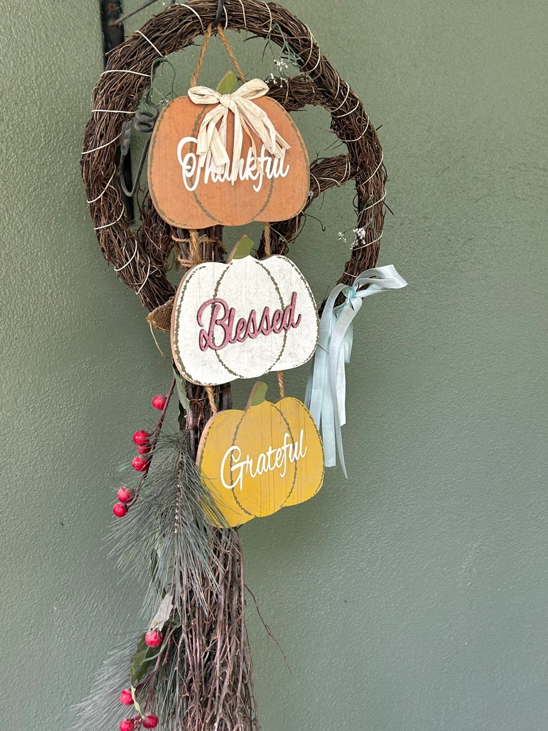 Cute fall harvest wreath featuring three pumpkin-shaped wooden signs. Each sign has a different word: Thankful, Blessed, and Grateful. Perfect for adding a touch of autumn charm to your home!