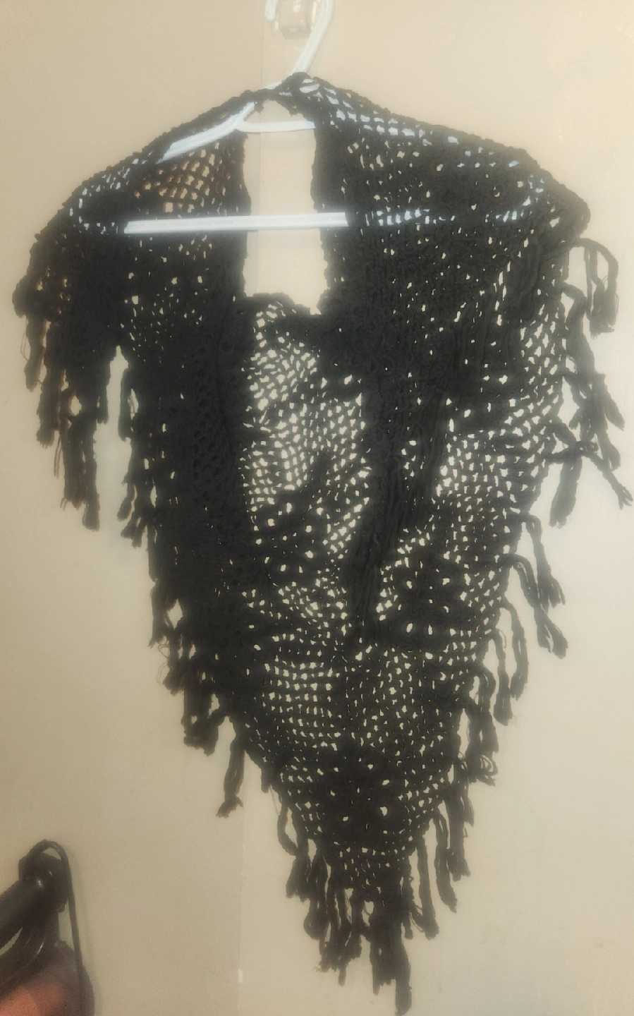 Selling a black crochet shawl. It's in good condition and would be a great addition to any wardrobe. Pick up only.