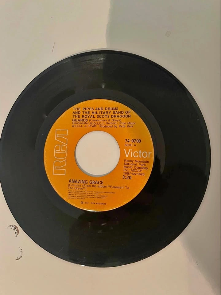 Classic 1972 RCA Victor U.S. pressing featuring the global hit “Amazing Grace” performed by the Pipes and Drums and the Military Band of the Royal Scots Dragoon Guards. B-side includes “Cornet Carillon.” A beautiful slice of military pipe band history.