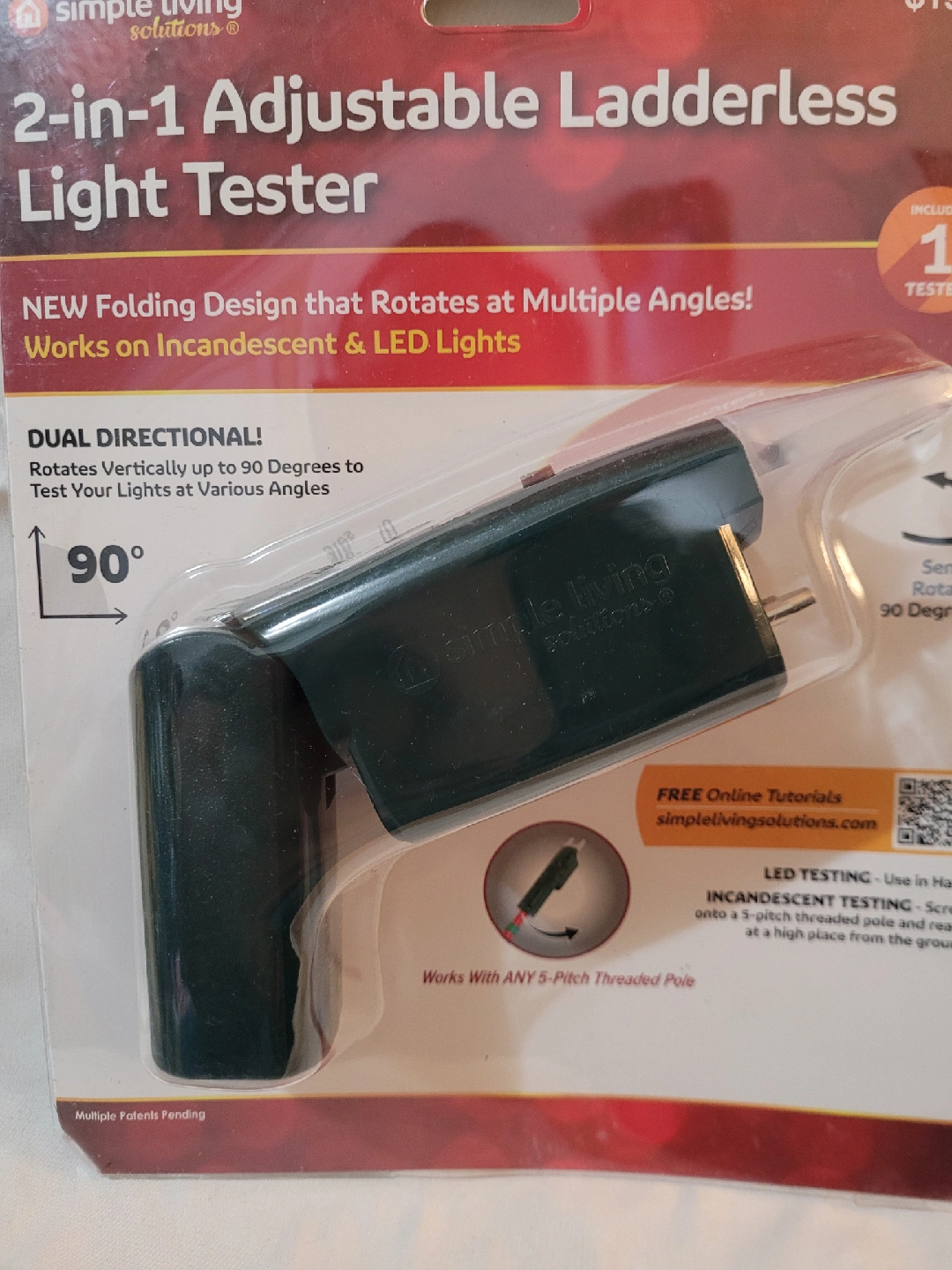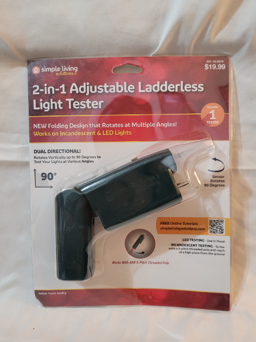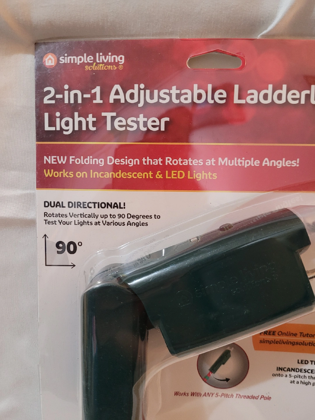I'm selling a Simple Living Solutions 2-in-1 Adjustable Ladderless Light Tester! It has a new folding design that rotates at multiple angles and works on incandescent and LED lights. Includes one tester. It's dual directional and rotates vertically up to 90 degrees to test your lights at various angles. Sensor rotates 90 degrees. It works with any 5-pitch threaded pole. Originally bought for $19.99