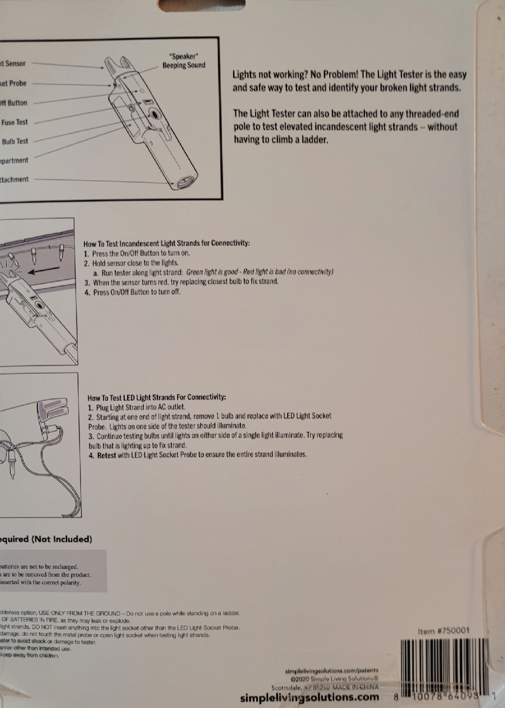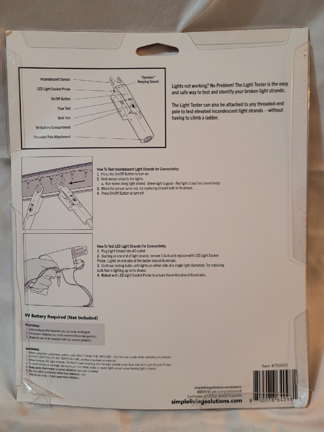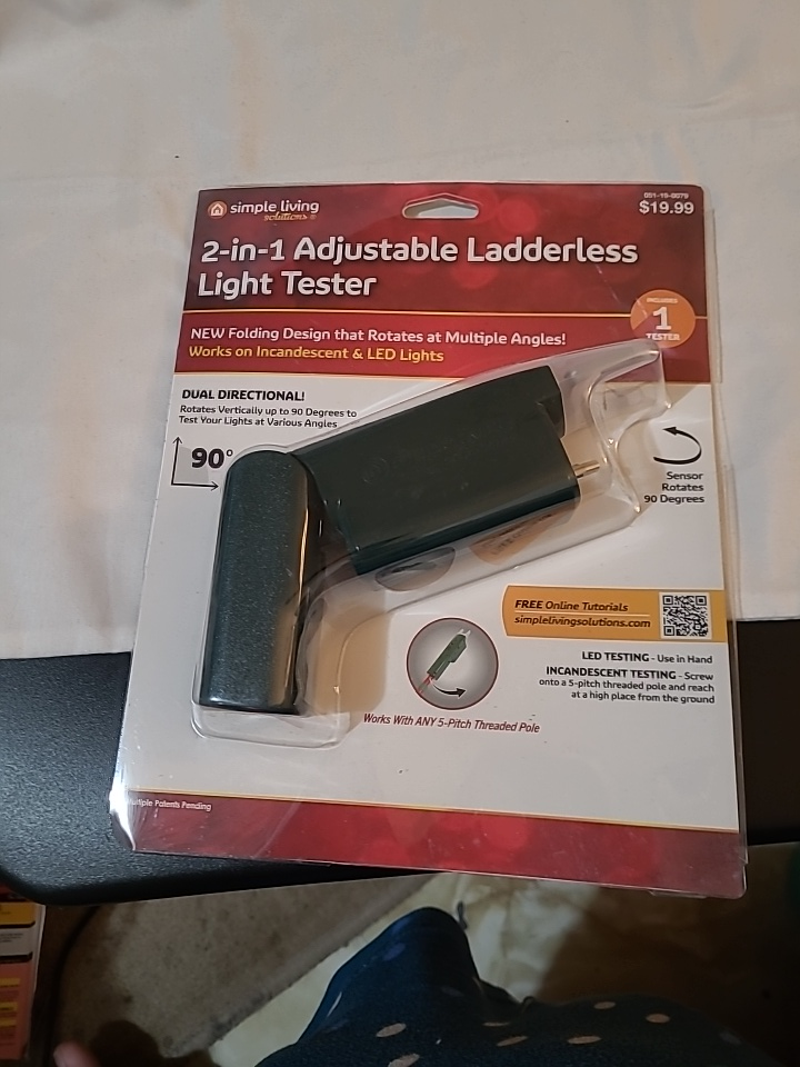 I'm selling a Simple Living Solutions 2-in-1 Adjustable Ladderless Light Tester! It has a new folding design that rotates at multiple angles and works on incandescent and LED lights. Includes one tester. It's dual directional and rotates vertically up to 90 degrees to test your lights at various angles. Sensor rotates 90 degrees. It works with any 5-pitch threaded pole. Originally bought for $19.99