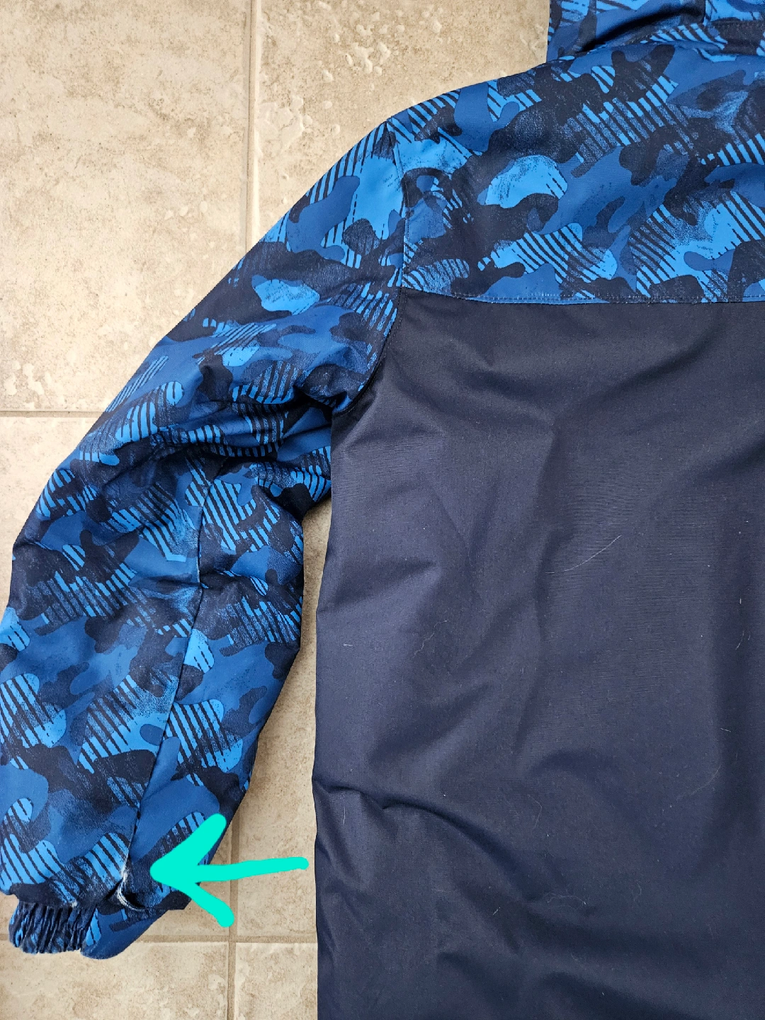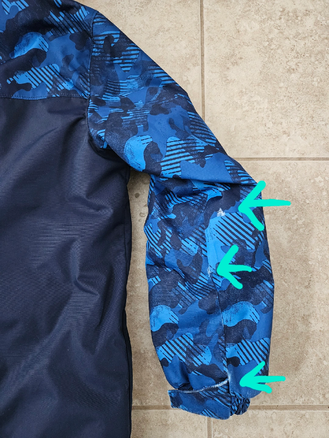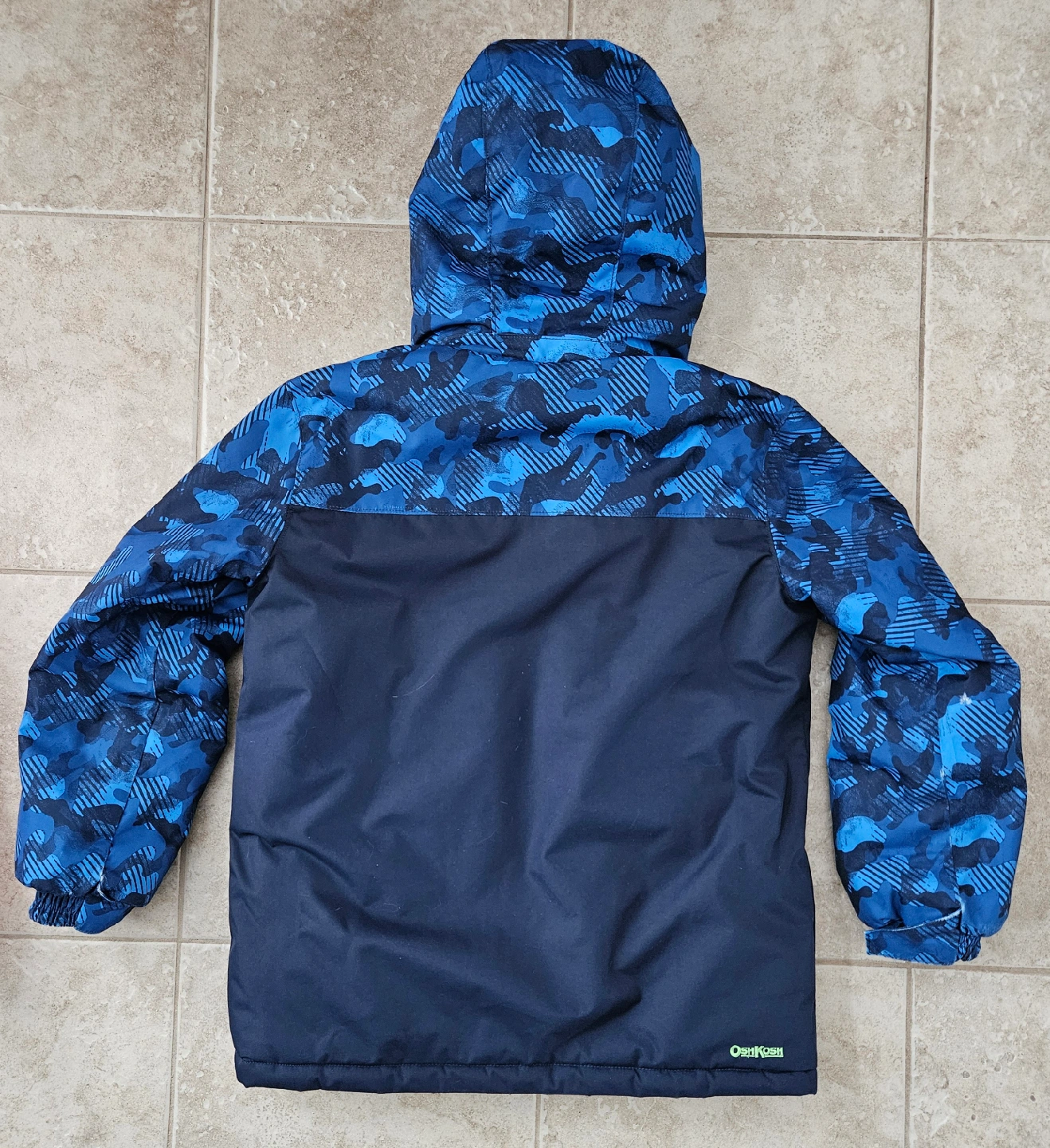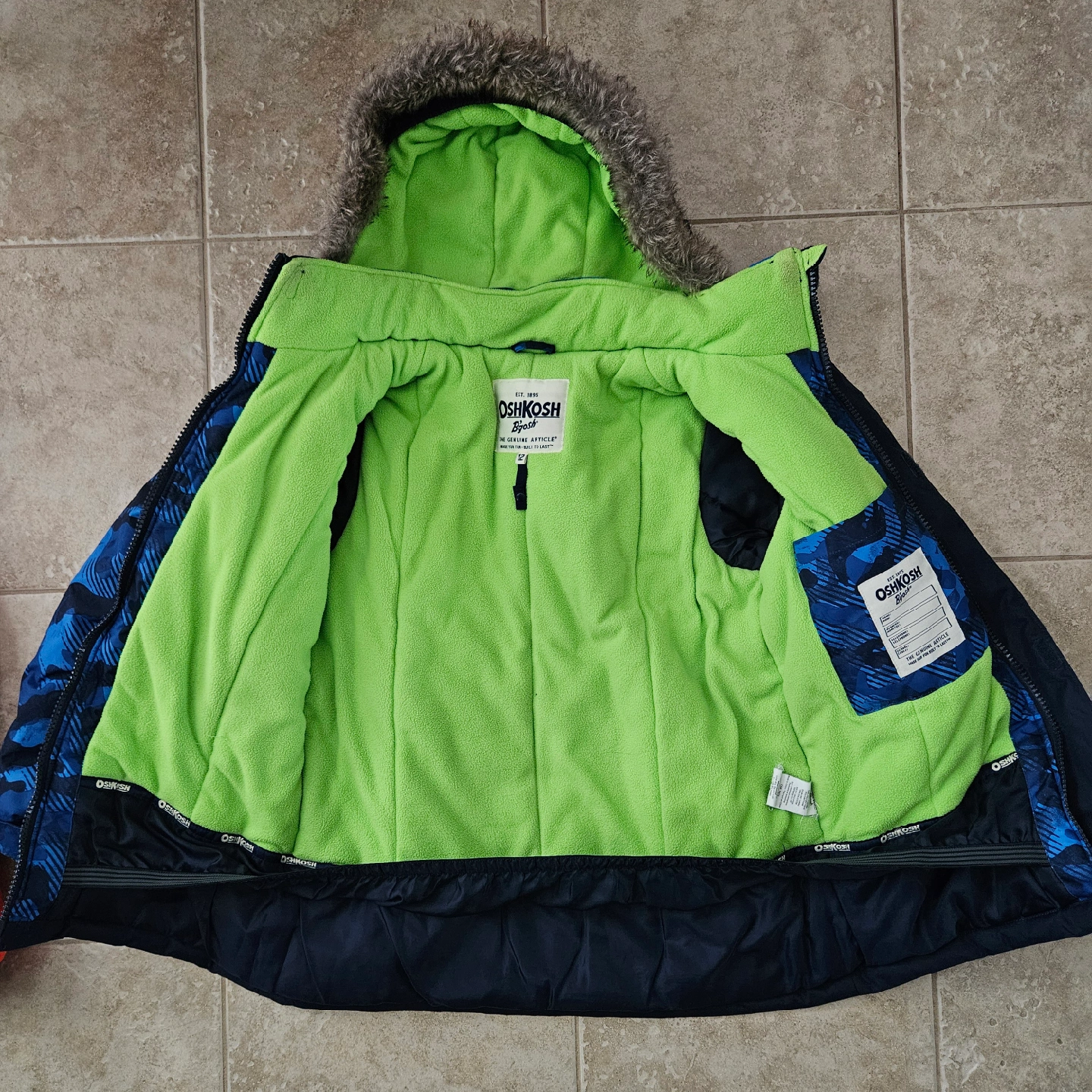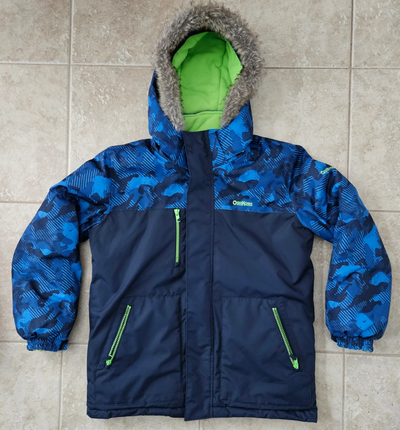 Very warm OshKosh Winter Jacket, size 12, in good condition. There is a small hole and some wear on front of one arm and some wear on wrist areas. The hole and wear is shown in the pictures. Milton pick up, cash only, no holds.