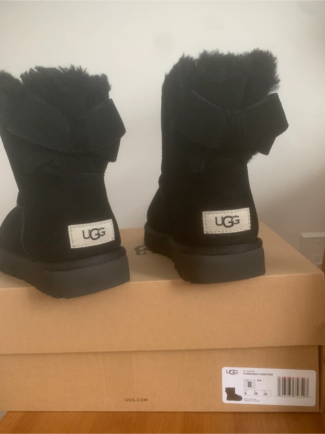 Selling a pair of UGG Mini Bailey Suede Bow boots in black, size 8! These stylish and cozy boots are perfect for keeping your feet warm and looking great. They are in excellent condition and come with the original box. Don't miss out on these adorable UGG boots!