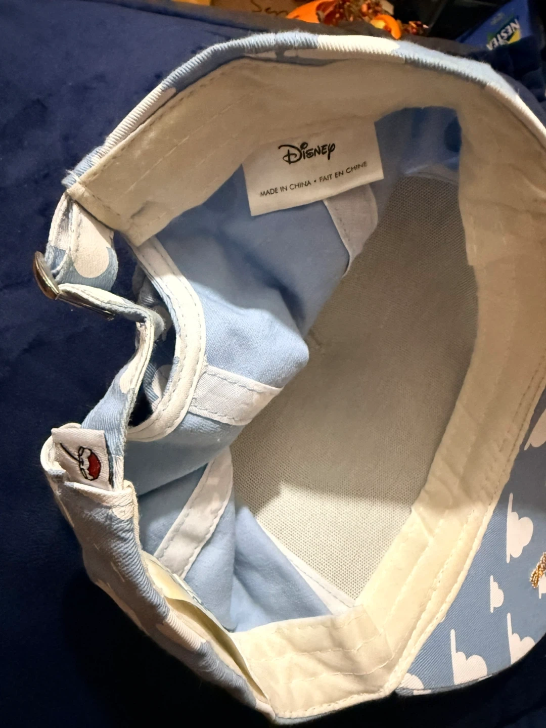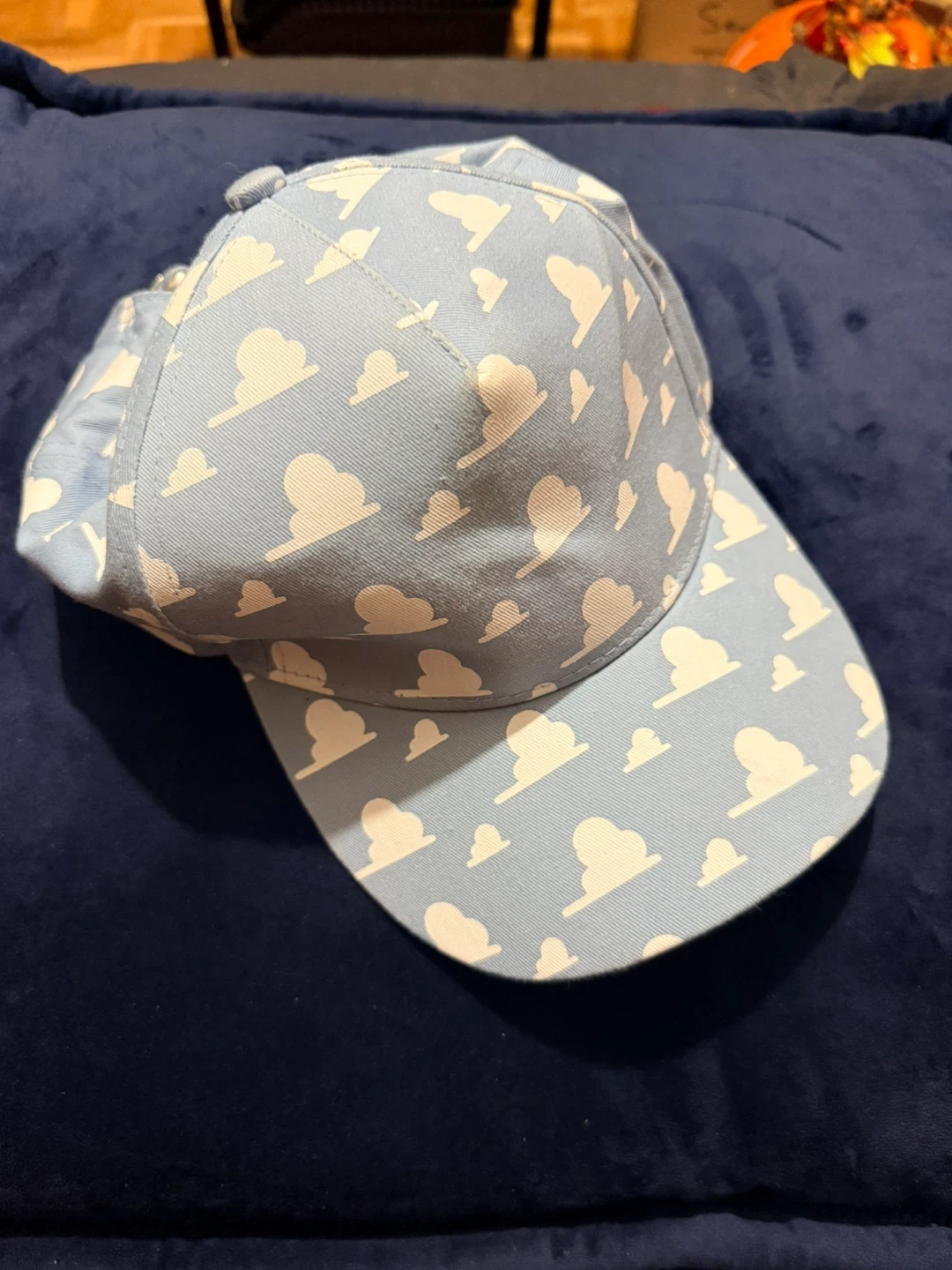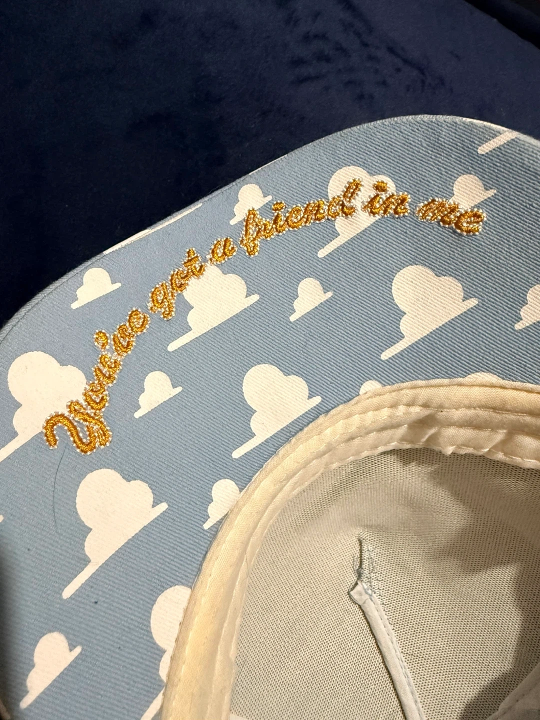 Super cute Disney Toy Story hat with the iconic cloud print (Andy’s wallpaper)! It also has the phrase "You've got a friend in me" embroidered on the inner brim of the hat. From the brand Cakeworthy.