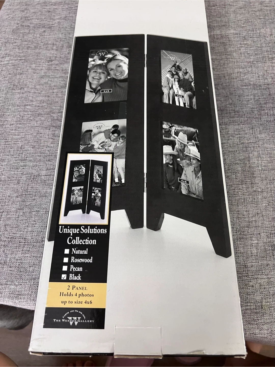 Selling a 2-panel picture frame from The Weston Gallery! It holds 4 photos up to size 4x6. The frame is black and in great condition. It comes in the original box!