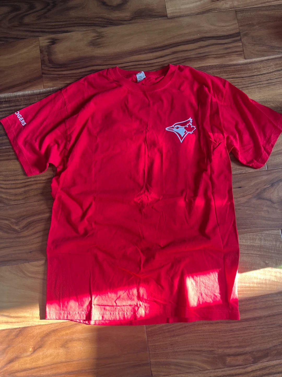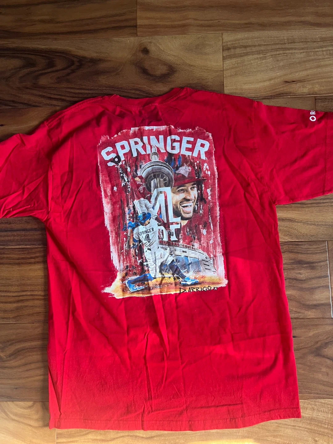Selling a red Blue Jays t-shirt featuring George Springer! It's in great condition and has the Blue Jays logo on the front and a Springer graphic on the back Follow Nextgen_kicks_416