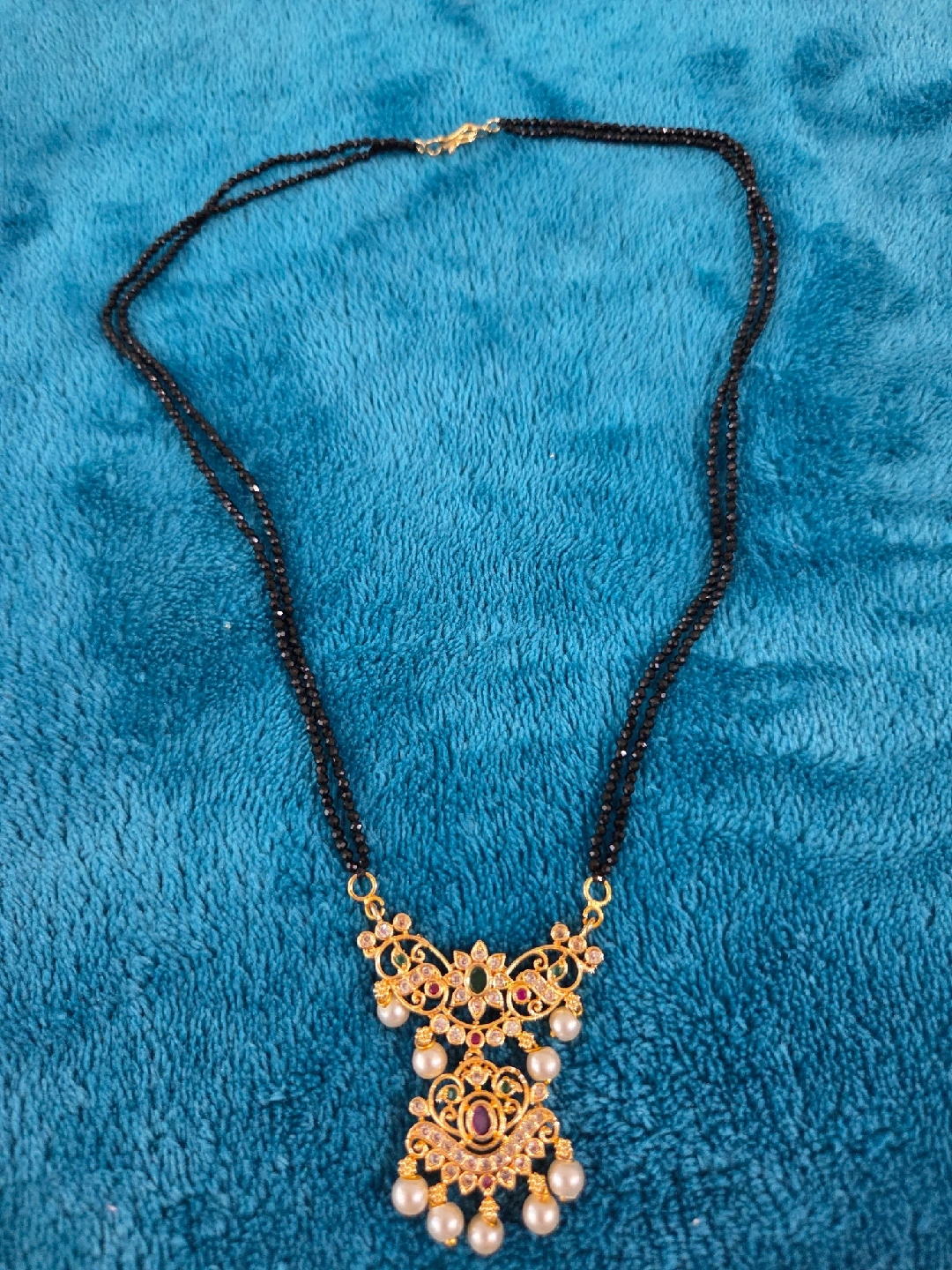 10Selling a beautiful black beaded necklace with a gold-tone pendant. The pendant is adorned with pearls and colourful stones, adding a touch of elegance to any outfit!