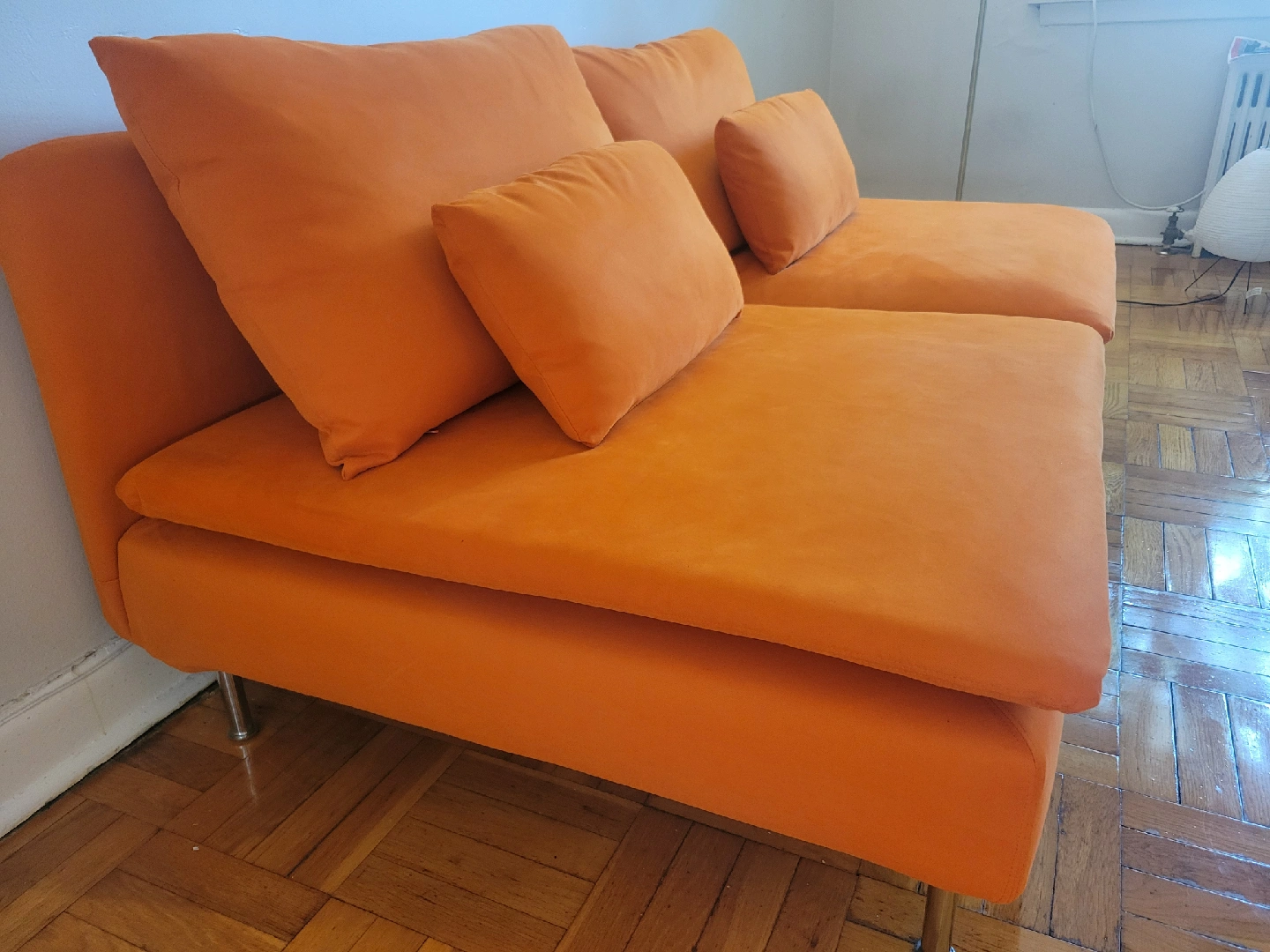 Fun colourful Ikea Soderhamn couch in a discontinued orange colour. Removable, washable covers. Modular - there are corner pieces and armrests that can be added on.