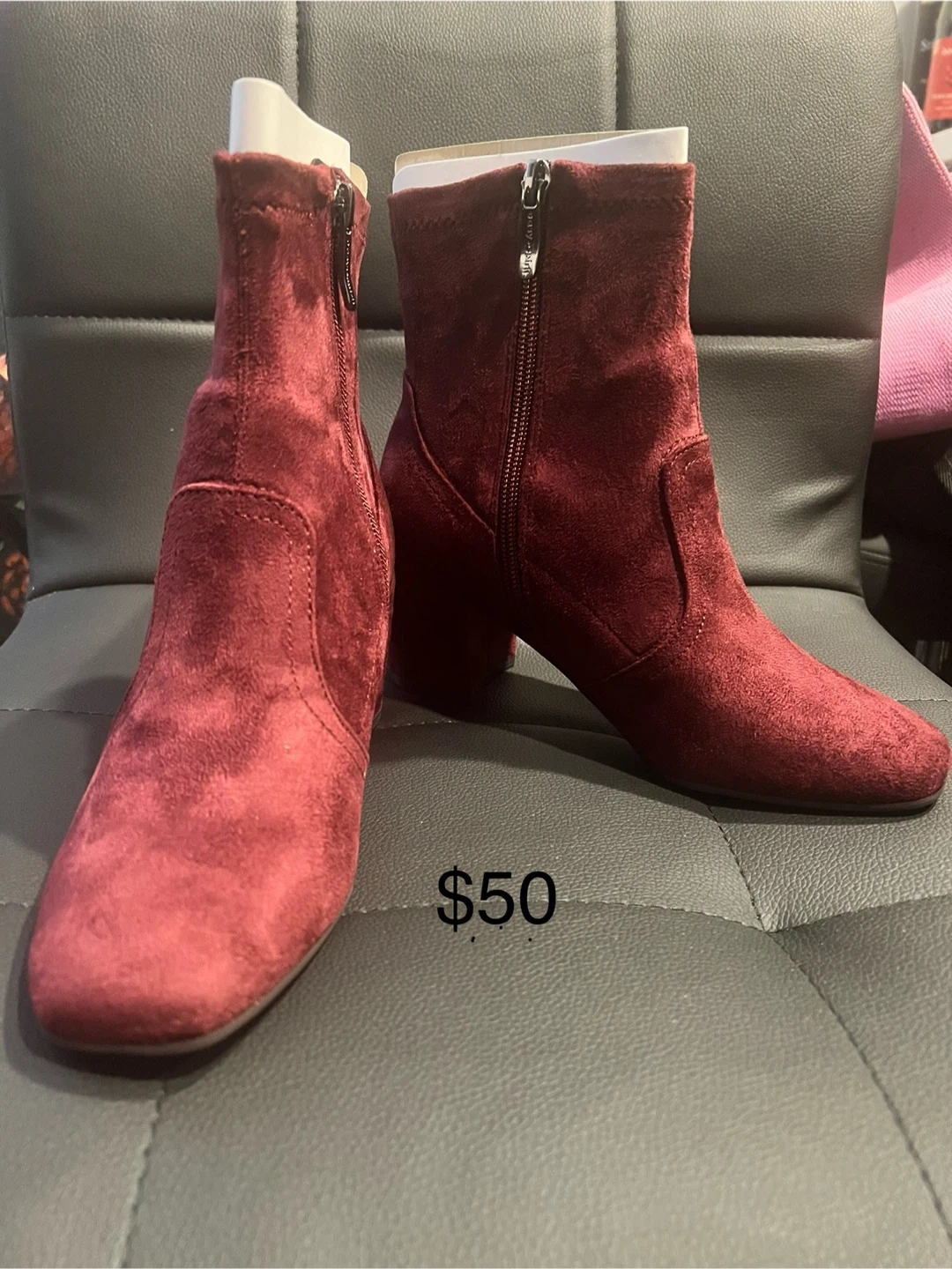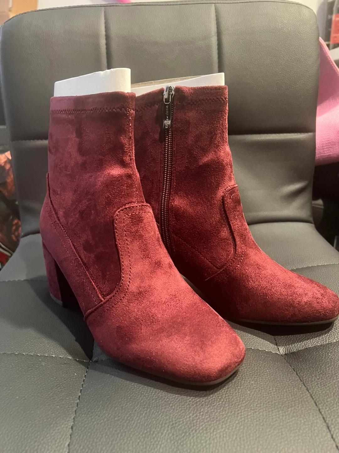 These burgundy ankle boots are brand new! They have a side zipper and a comfortable heel height. Perfect for fall!