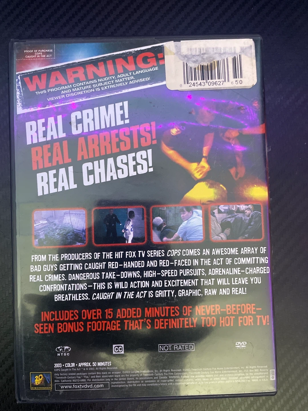 Selling a COPS Caught in the Act DVD. This DVD contains real crime, real arrests, and real chases! It includes over 15 added minutes of never-before-seen bonus footage that's definitely too hot for TV! Colour. Approx. 50 minutes