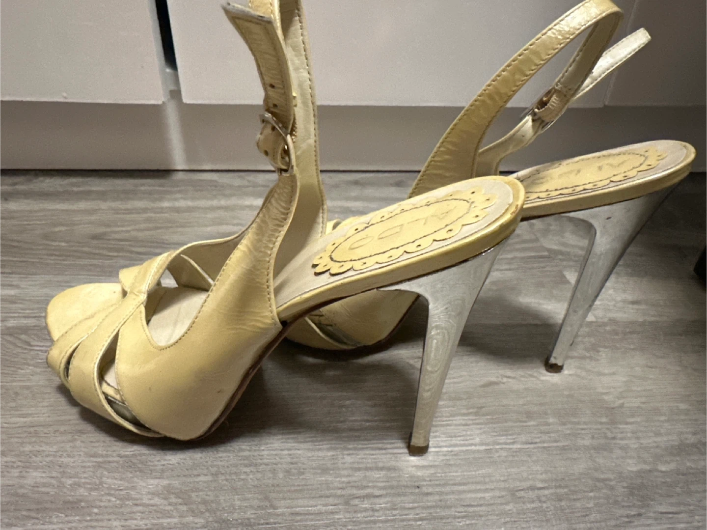 132Free a pair of Aldo heels in size 7. 5. They are a light beige colour with a silver heel.