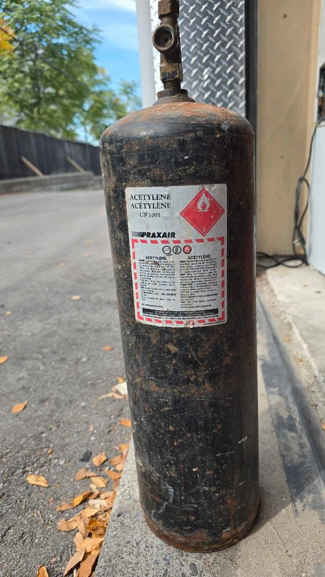 Praxair Acetylene Tank, designed for welding and cutting applications. This tank is used and shows signs of wear, but it is fully functional and ready for your projects. The tank is labelled with necessary safety and handling information. Additional specifications: * Brand: Praxair * Gas Type: Acetylene * Condition: Used I'm not quite sure how many balloons this tank can fill, but it is definitely more suited for heavy-duty tasks. If the ad is up, it's available!