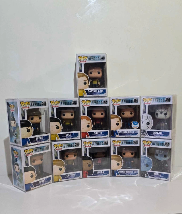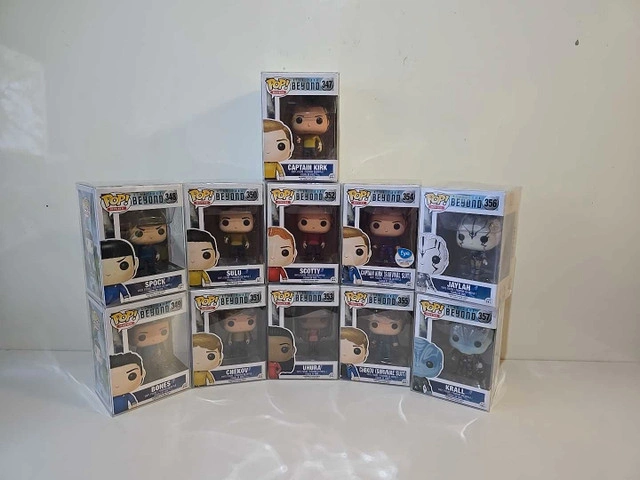 Get ready to boldly go where no one has gone before with this complete set of Funko Pop! Star Trek Beyond figures! This collection includes all your favourite characters from the movie, each in their original boxes and in great condition. Beam them up to your collection today! These collectibles are used and are in good condition.