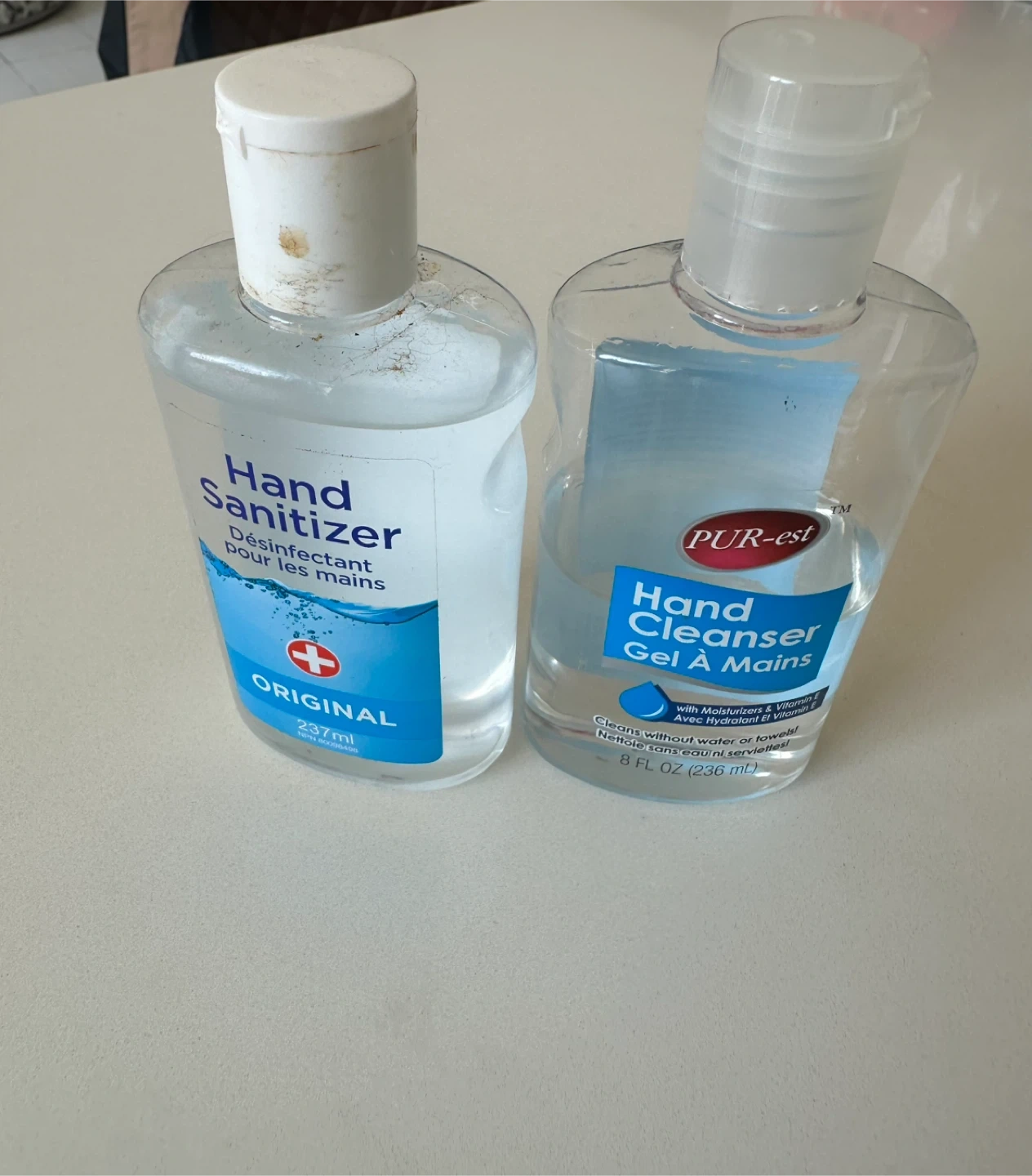 Selling two bottles of hand sanitizer. One is a Hand Sanitizer Original (237ml) and the other is a Pur-est Hand Cleanser Gel À Mains (236ml).