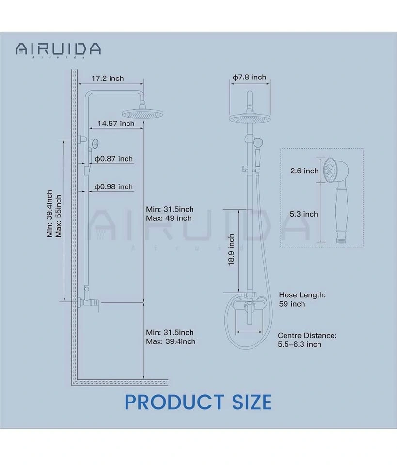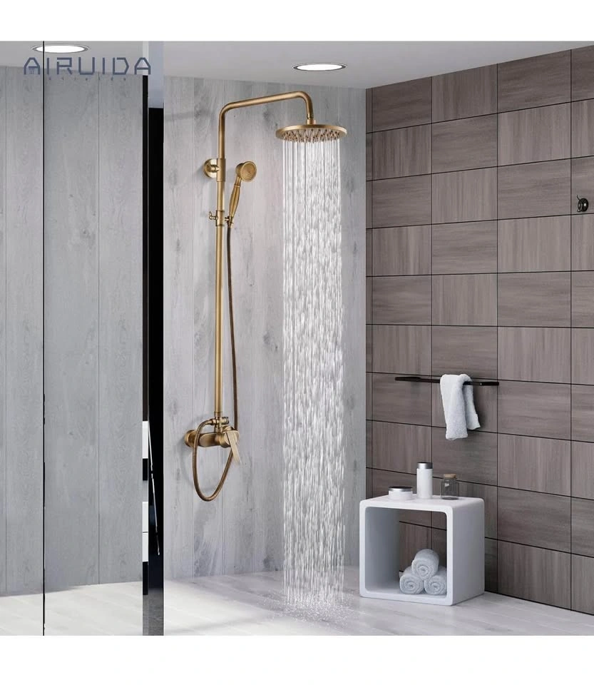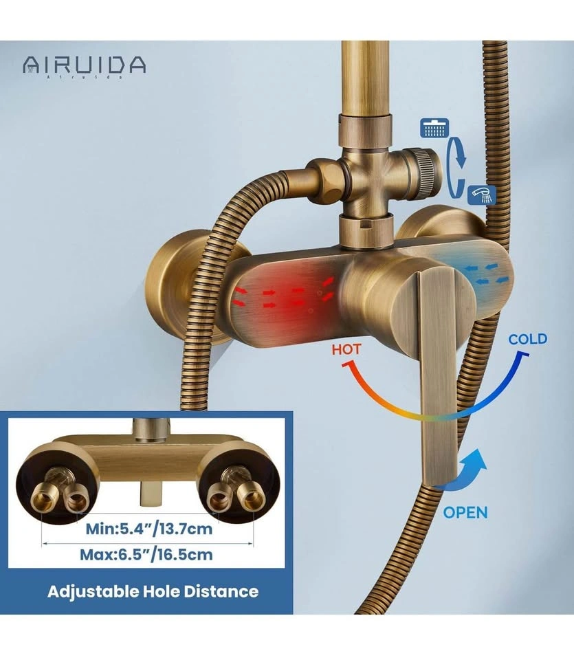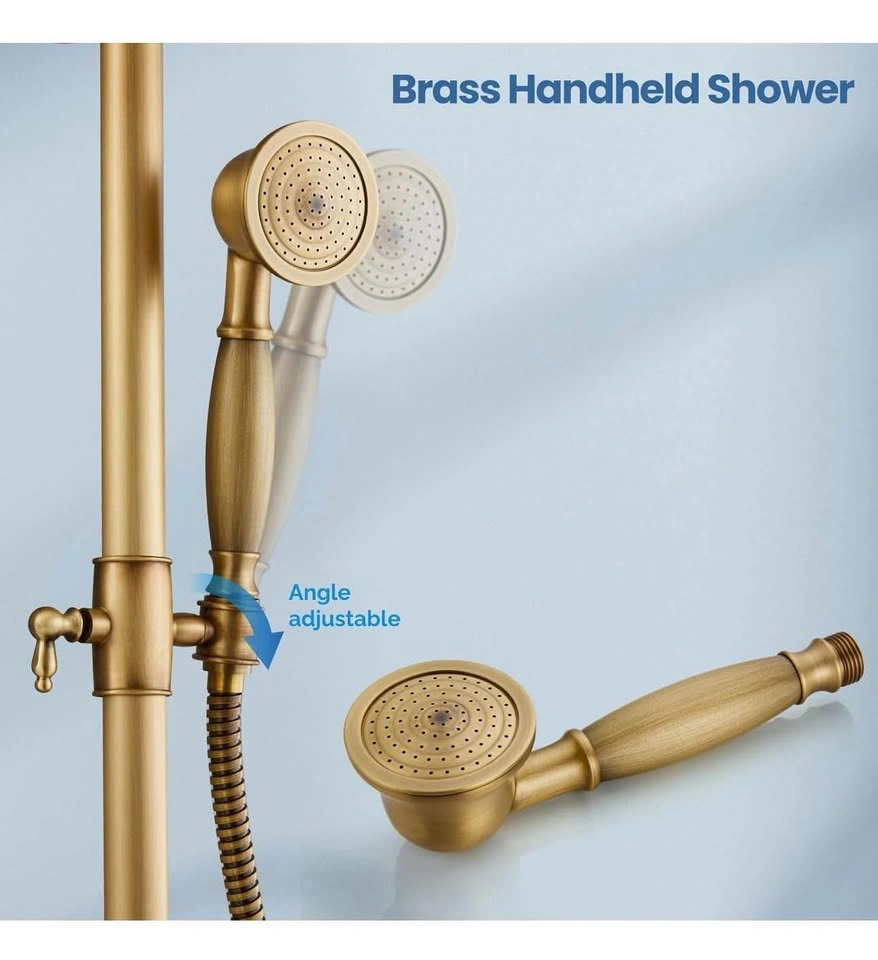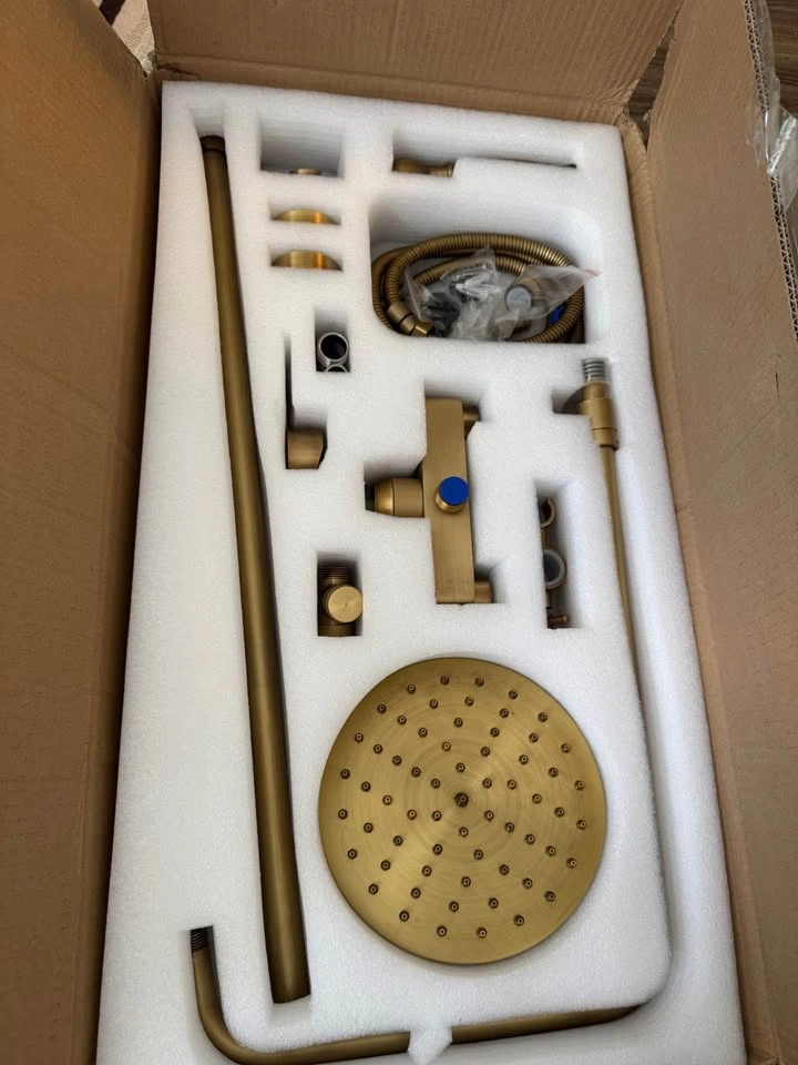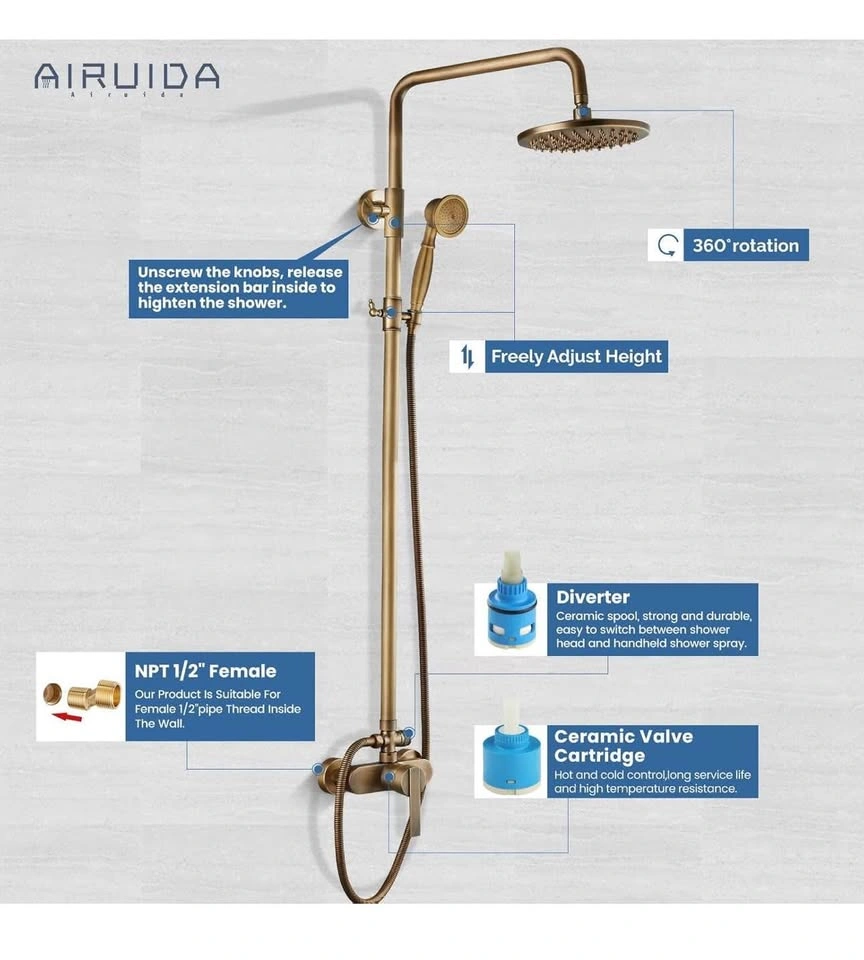 This item is brand new in box Pickup Location @ East York, Toronto Please swap the photos, check for more item details. Antique Brass Exposed Pipe Shower System Single handle 8 Inch Rainfall Shower Head Solid copper Diverter Adjustable Shower Head Bar Modern Dual Functions Shower Faucet Combo Unit Set [Material]:Constructed from solid brass, antique brass finish can prevent to be discolored, rusty for long time daily use. [Dual Function]:Overhead rainfall shower and hand held spray.Solid brass diverter switches between top shower and hand spray. Single handle control water flow and temperature. [Adjustment Design]:Shower height(slide bar) can be adjustable between 100cm-140cm(39.4inch-55inch). Handheld shower also can be adjusted up and down on the rail. [Installation]:Wall mounted 2 hole installation type. Package include adjustable NPT 1/2 adapter. Come with installation instruction. It can tub mounted in Clawfoot, need to order the other adapter. If need a longer extension from the wall mounting base. Please contact us, we will made it for you.
