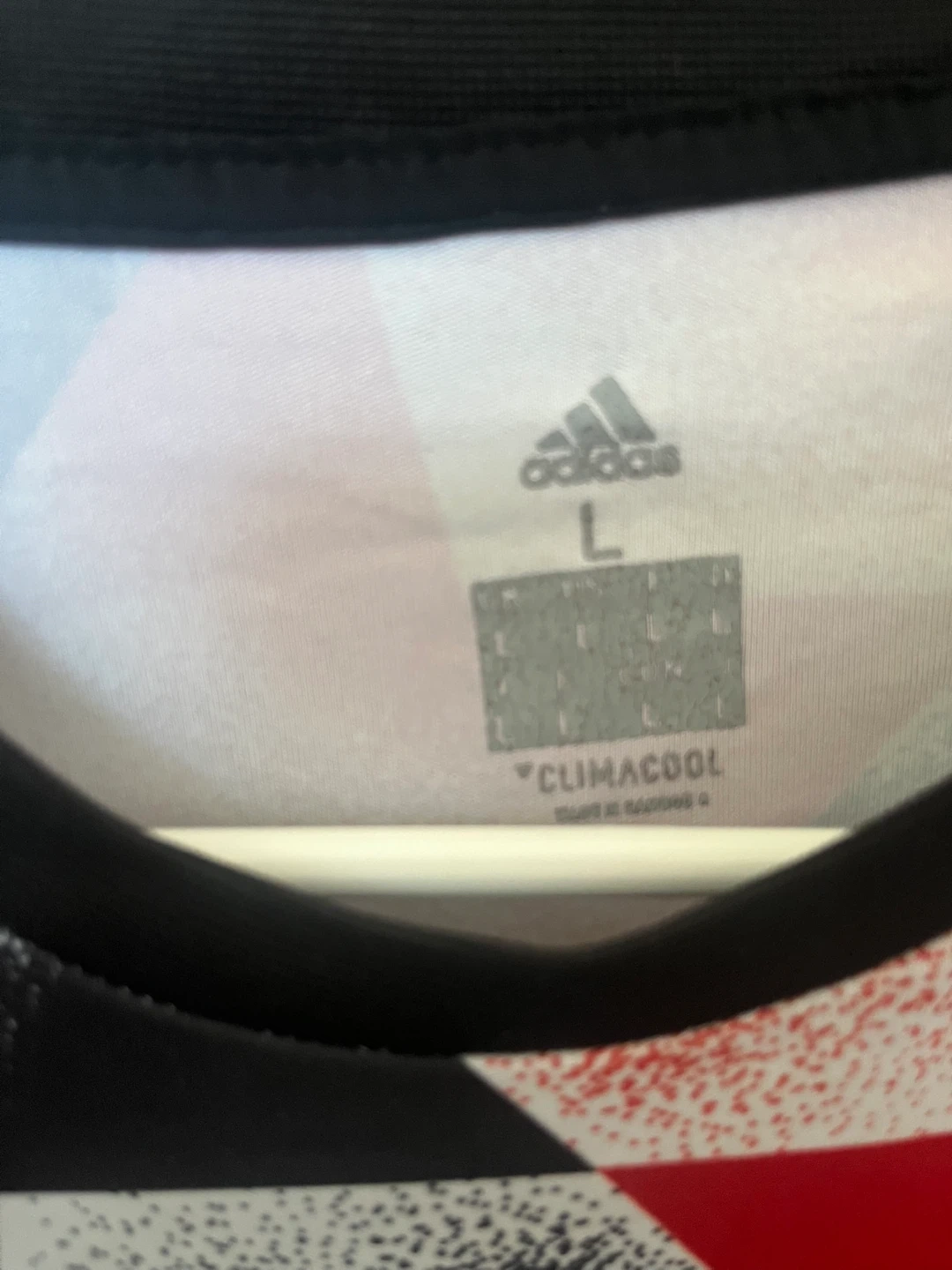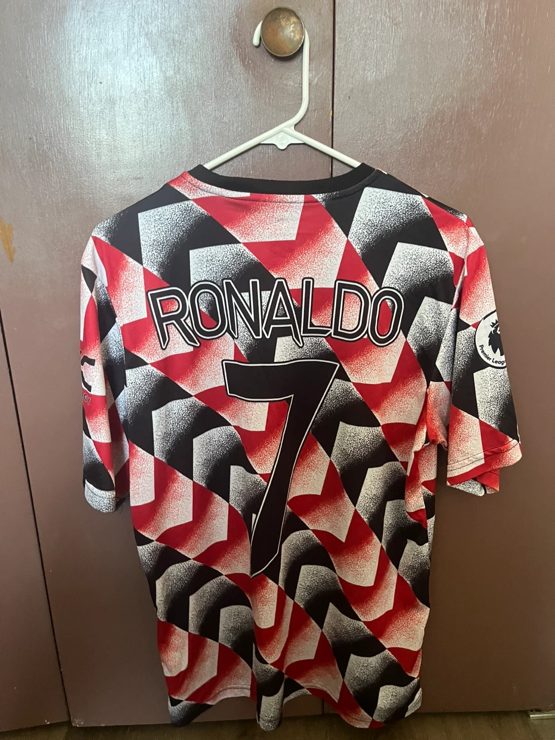 Selling an Adidas Manchester United Ronaldo jersey in size L. It's in great condition and features a unique geometric design in red, white, and black. The jersey also includes the TeamViewer logo and the Premier League badge, perfect for any fan!