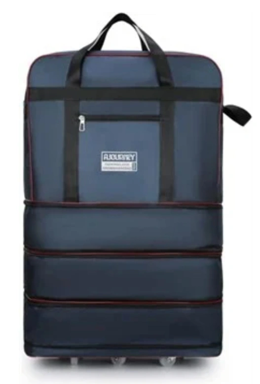 783This is a navy blue expandable rolling suitcase. It features a top handle and a front pocket. Perfect for travel!