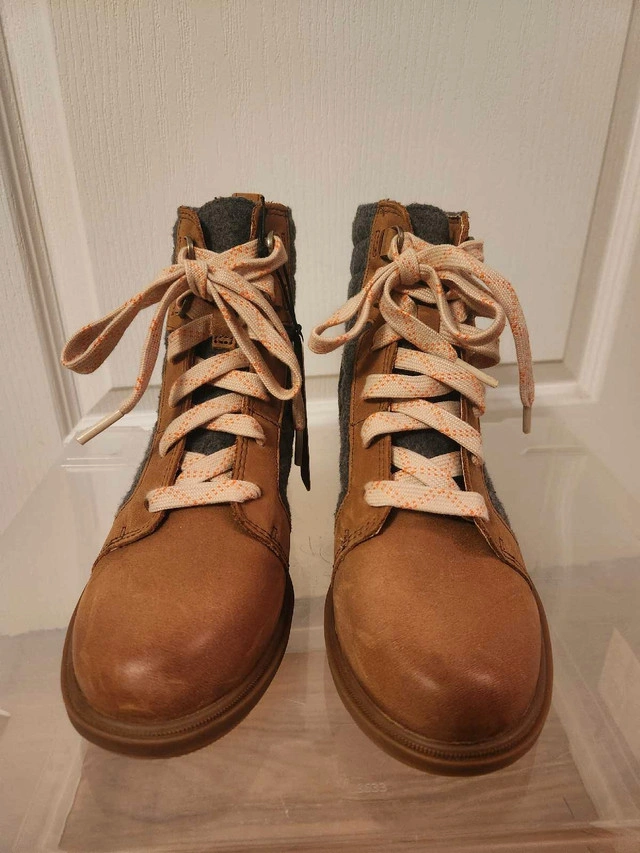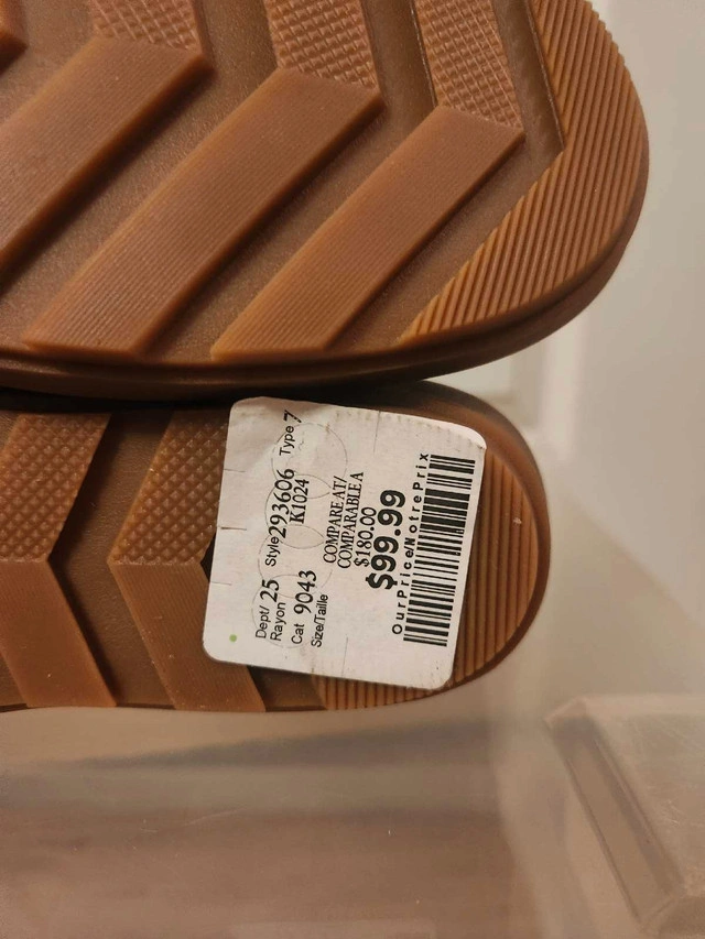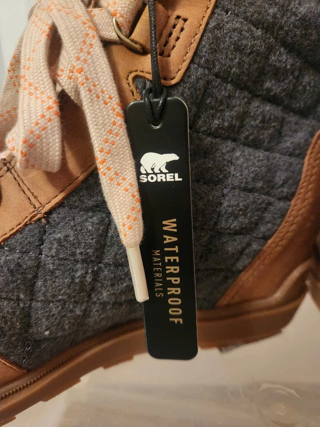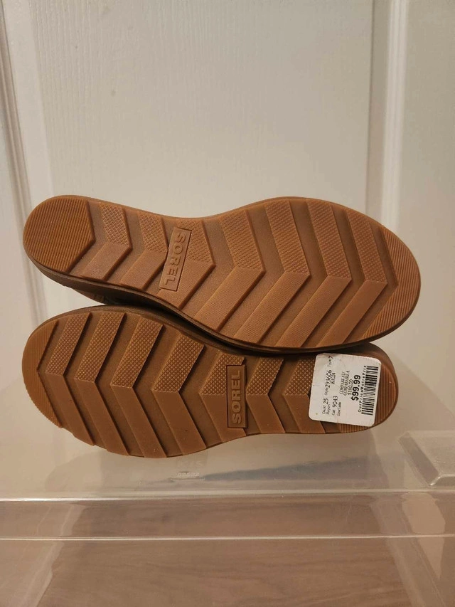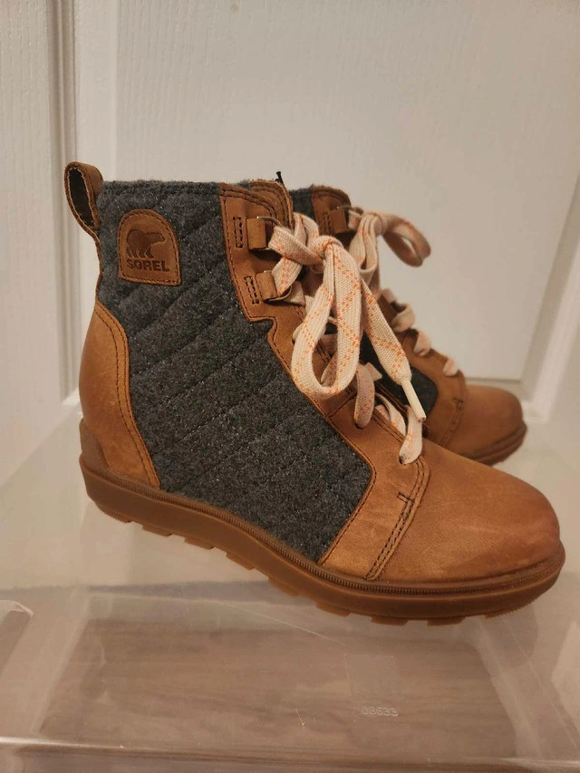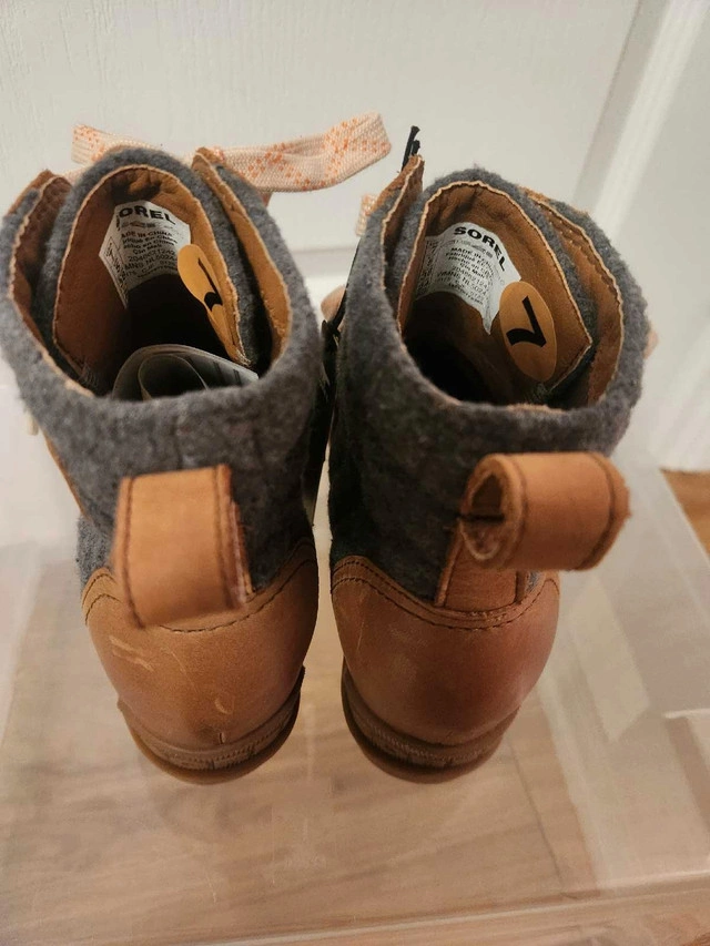 Fashionable and comfy hidden wedge cozy Sorel brand boots. Purchased as a gift but did not fit my daughter. Marked as size 7 but feel slightly smaller. Paid over $110 with tax, past return date. My loss your gain. Don't miss this super cute and comfy pair, fall is just around the corner!