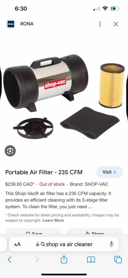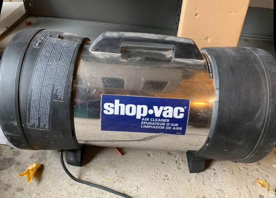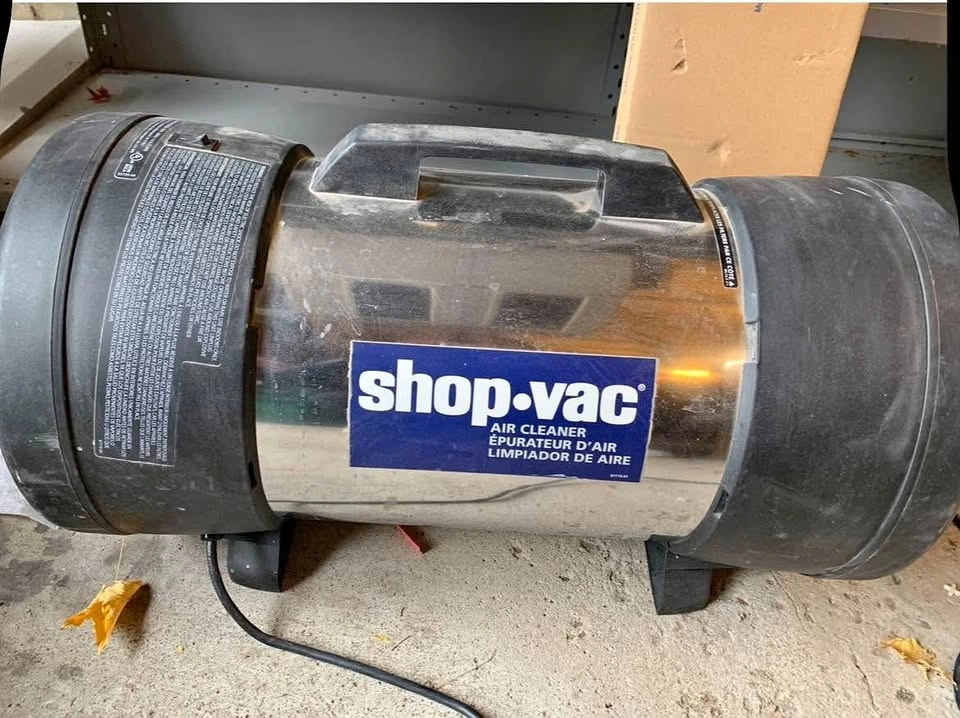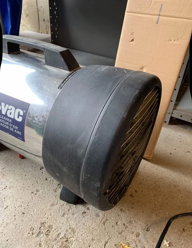 Portable air filter for workshop. The air cleaner filters air in a 290 square foot room every 10 minutes. 235 CFM over a large filter area.