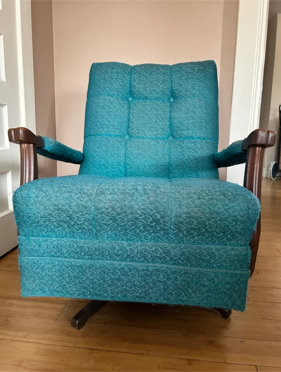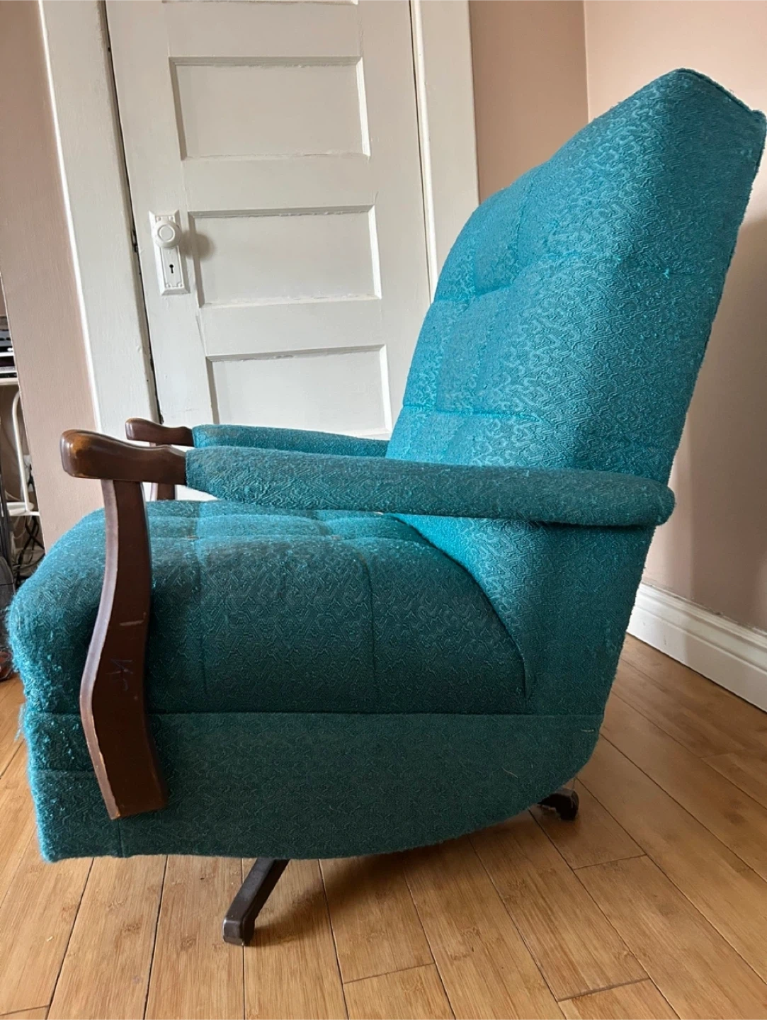 Mid-century swivel rocker chair. Teal upholstery, wooden arms (slight tear on right arm.) Very comfortable!
