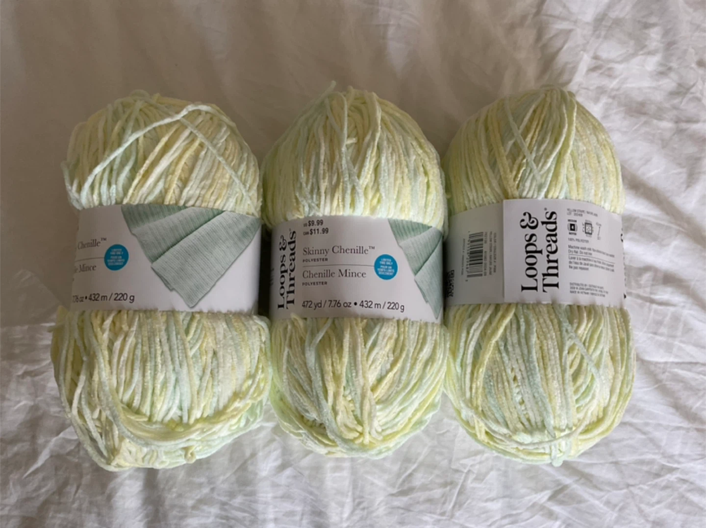 Selling three skeins of Loops & Threads Skinny Chenille yarn in the Yellow Stripe colourway!