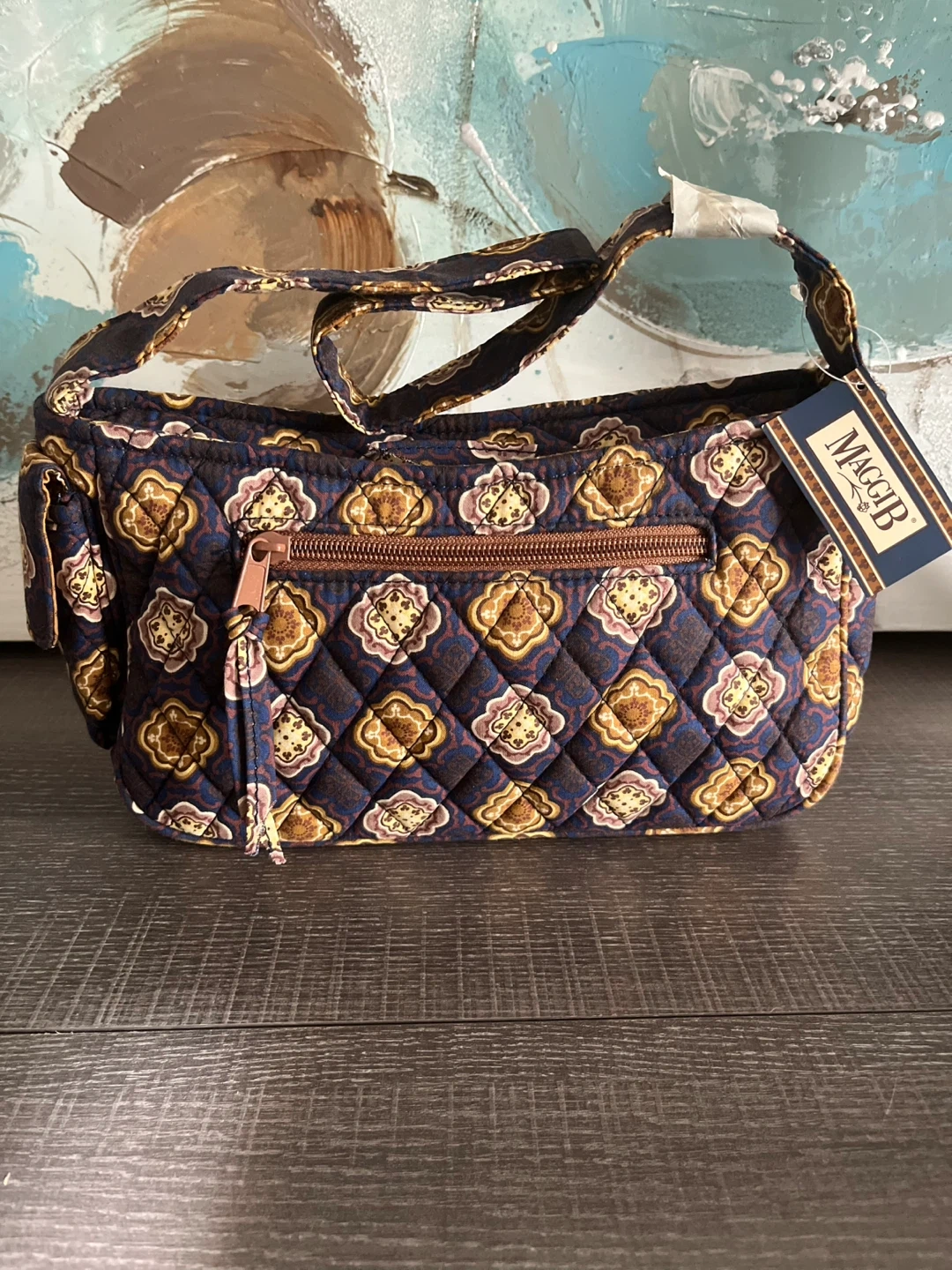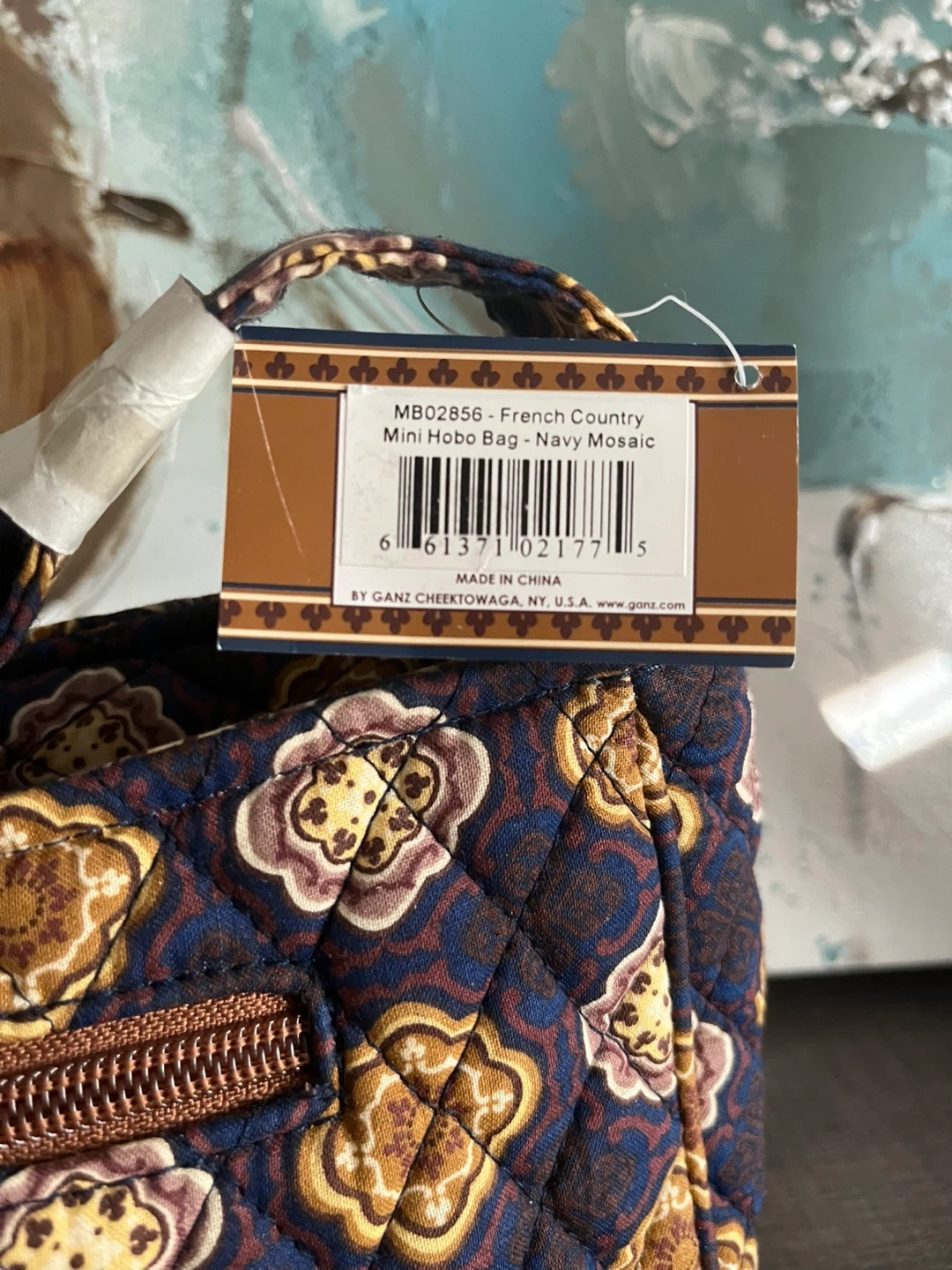 This is a MAGGIB French Country Mini Hobo Bag in Navy Mosaic. It's in new condition with the tag still attached! The bag features a quilted pattern with floral accents. Perfect for adding a touch of charm to any outfit