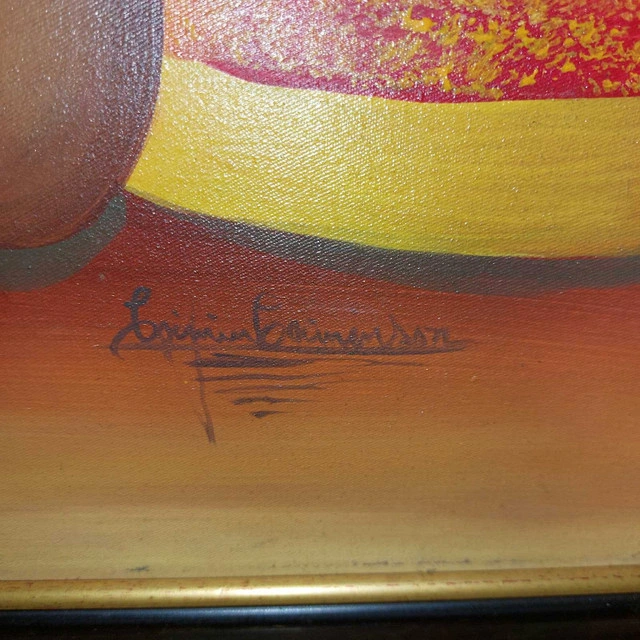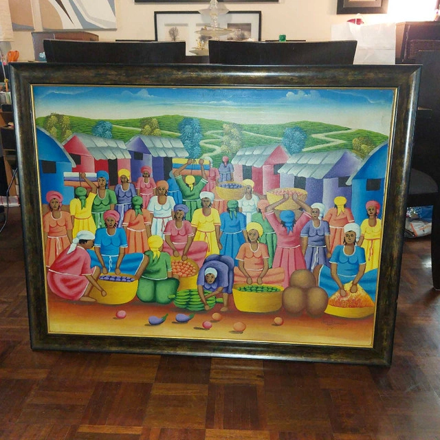 * **Artist**: Signed by a Haitian artist (signature available in the pictures). * **Dimensions**: Large format, perfect as a focal point in any room. APPROX 41.5" X 30" * **Frame**: Ornate, adding to the overall aesthetic.