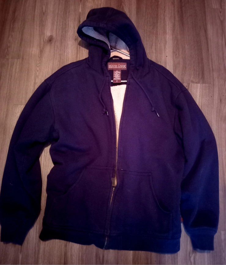 Cozy Moose Creek hoodie with a sherpa lining to keep you warm! It's a size large and made with a shell of 70% cotton and 30% polyester. The body and sleeve lining are 100% polyester. Perfect for those chilly Canadian days