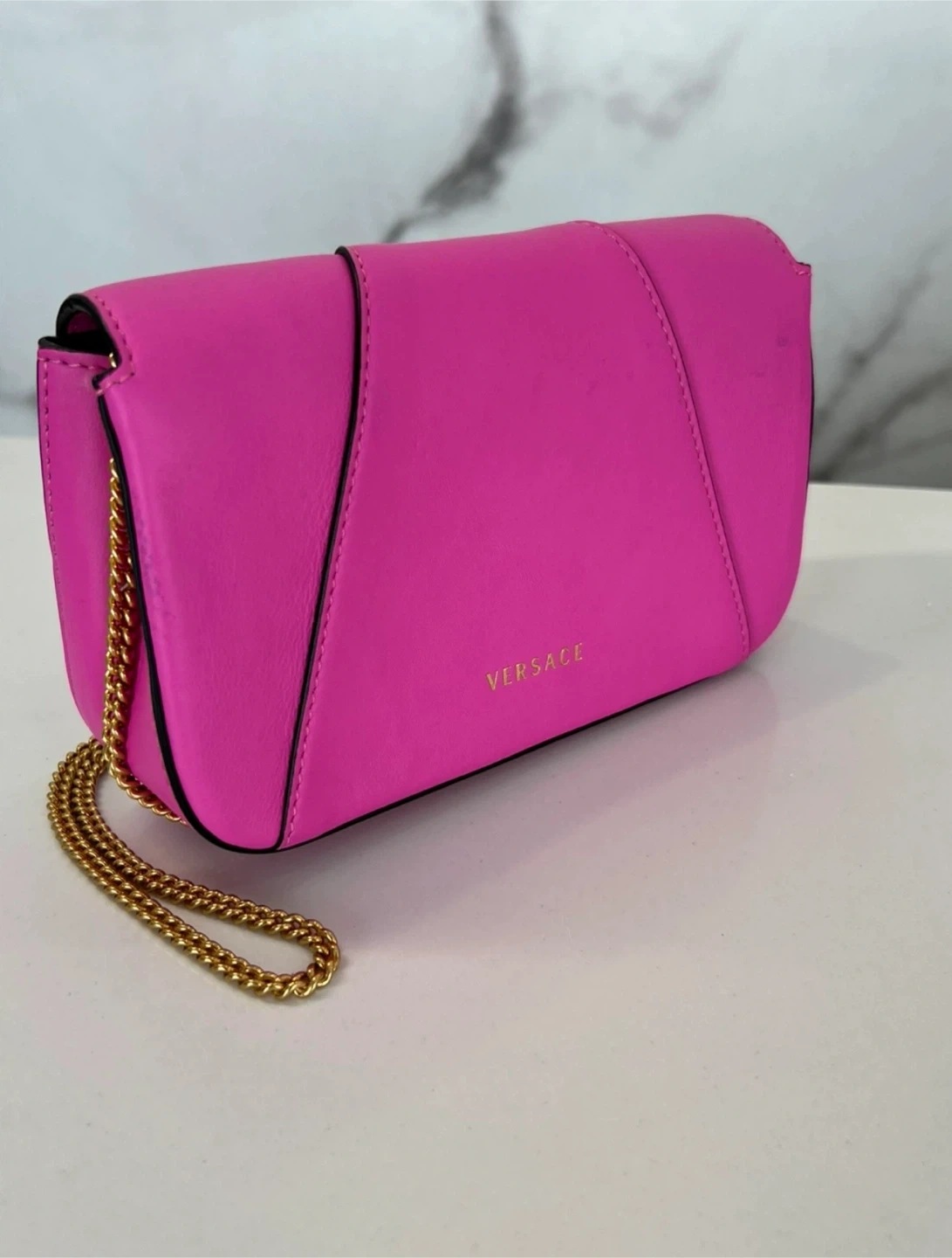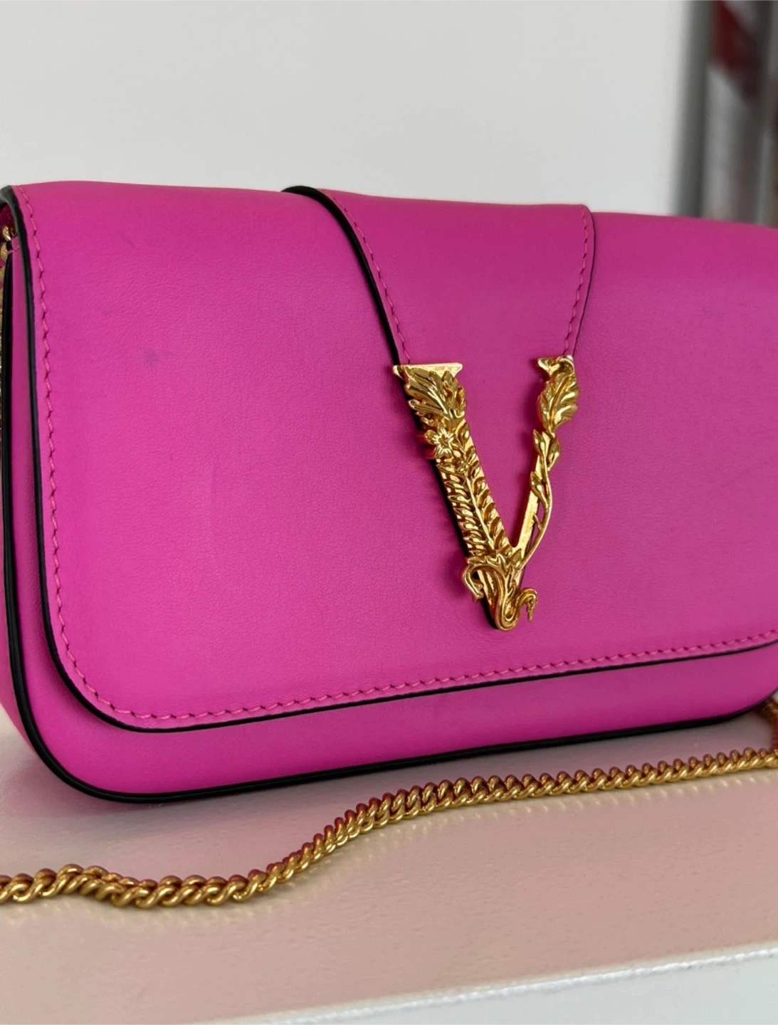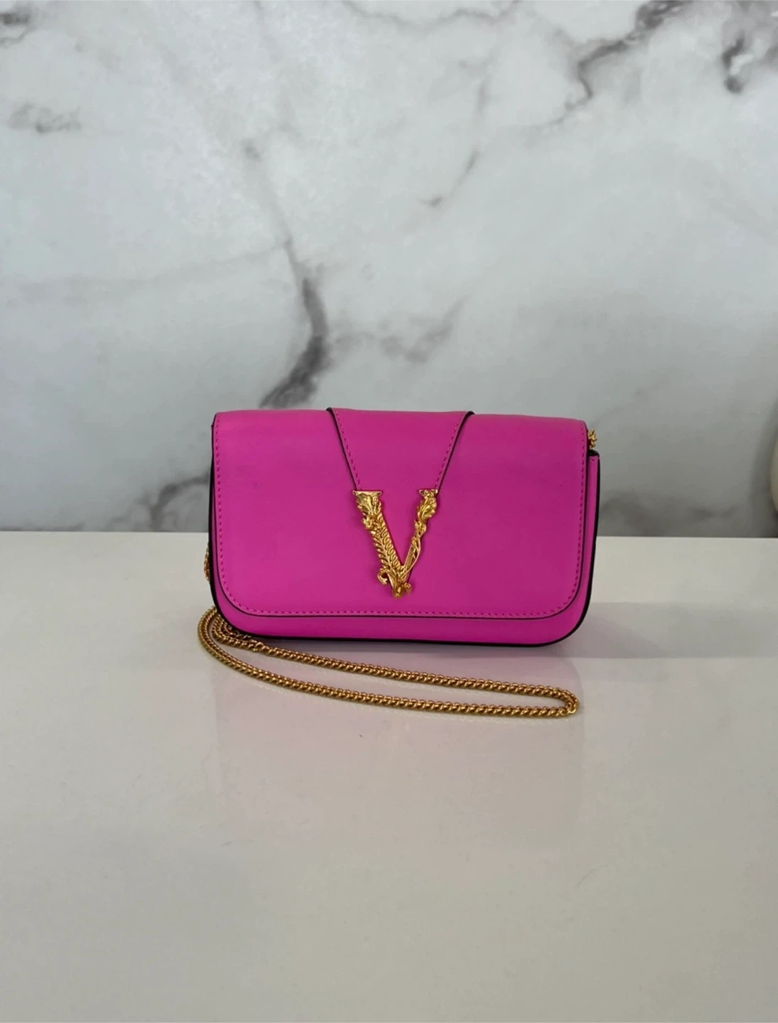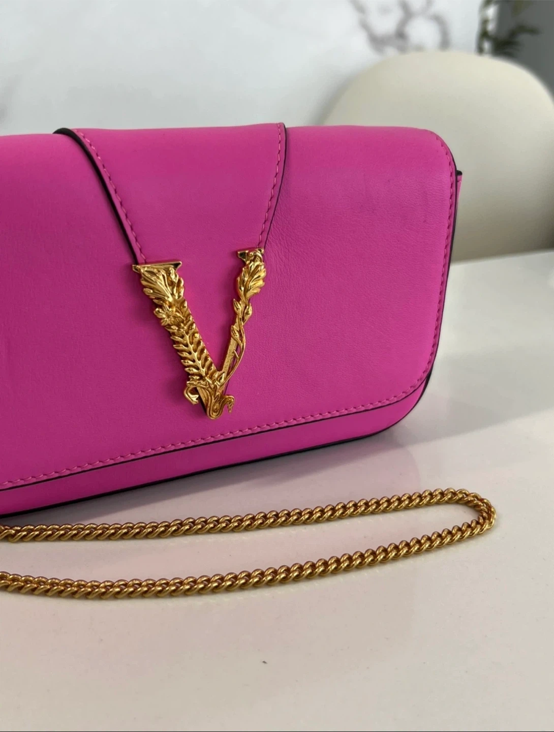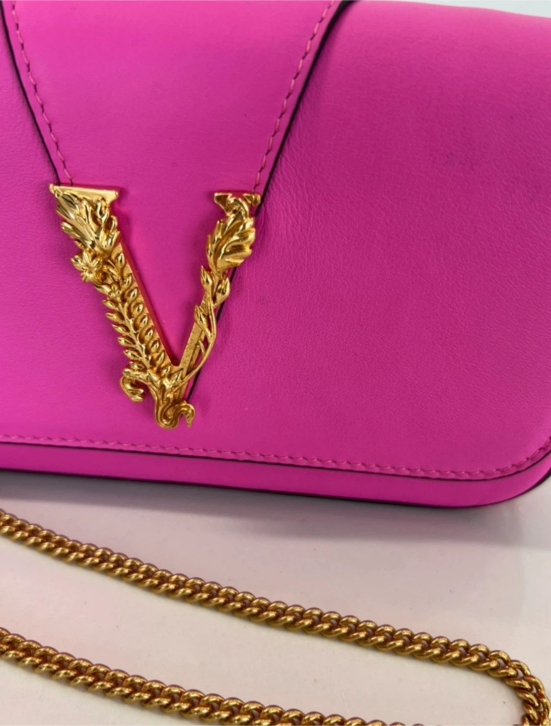 This is a beautiful Versace Virtus bag in a vibrant pink colour. The bag features a gold-tone chain strap and the iconic Versace 'V' logo. It's a stylish and eye-catching accessory!