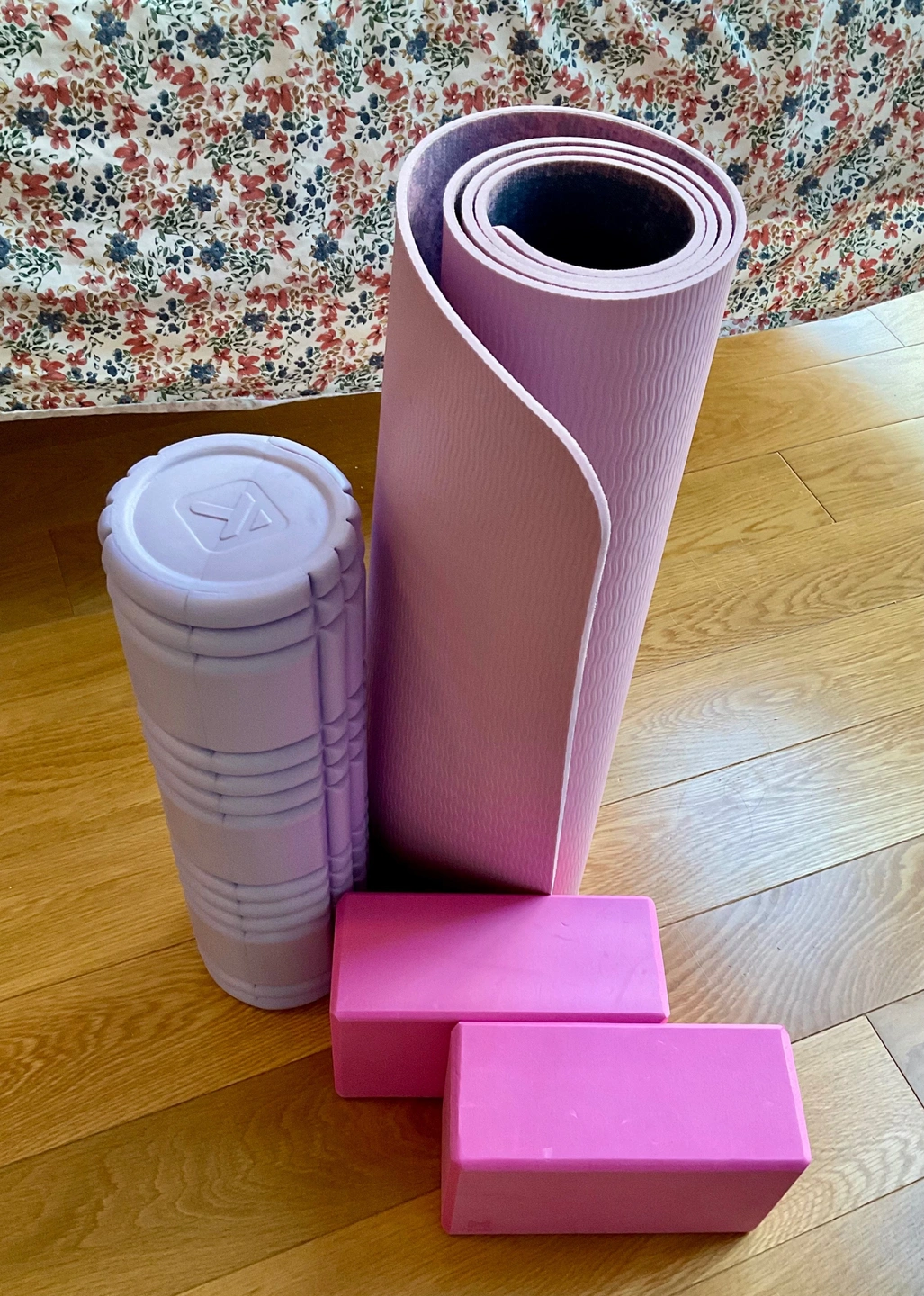 Home Yoga Kit, perfect for at-home workouts or yoga practice. Includes yoga mat, two yoga blocks, and foam roller. Great condition, only used infrequently for a few months, well maintained and disinfected after each use.