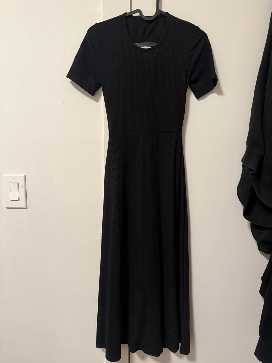 Selling a black ribbed midi dress. It's in great condition and features a unique cutout design on the back. Perfect for a casual or dressy look!